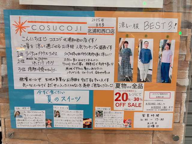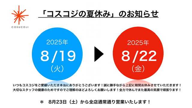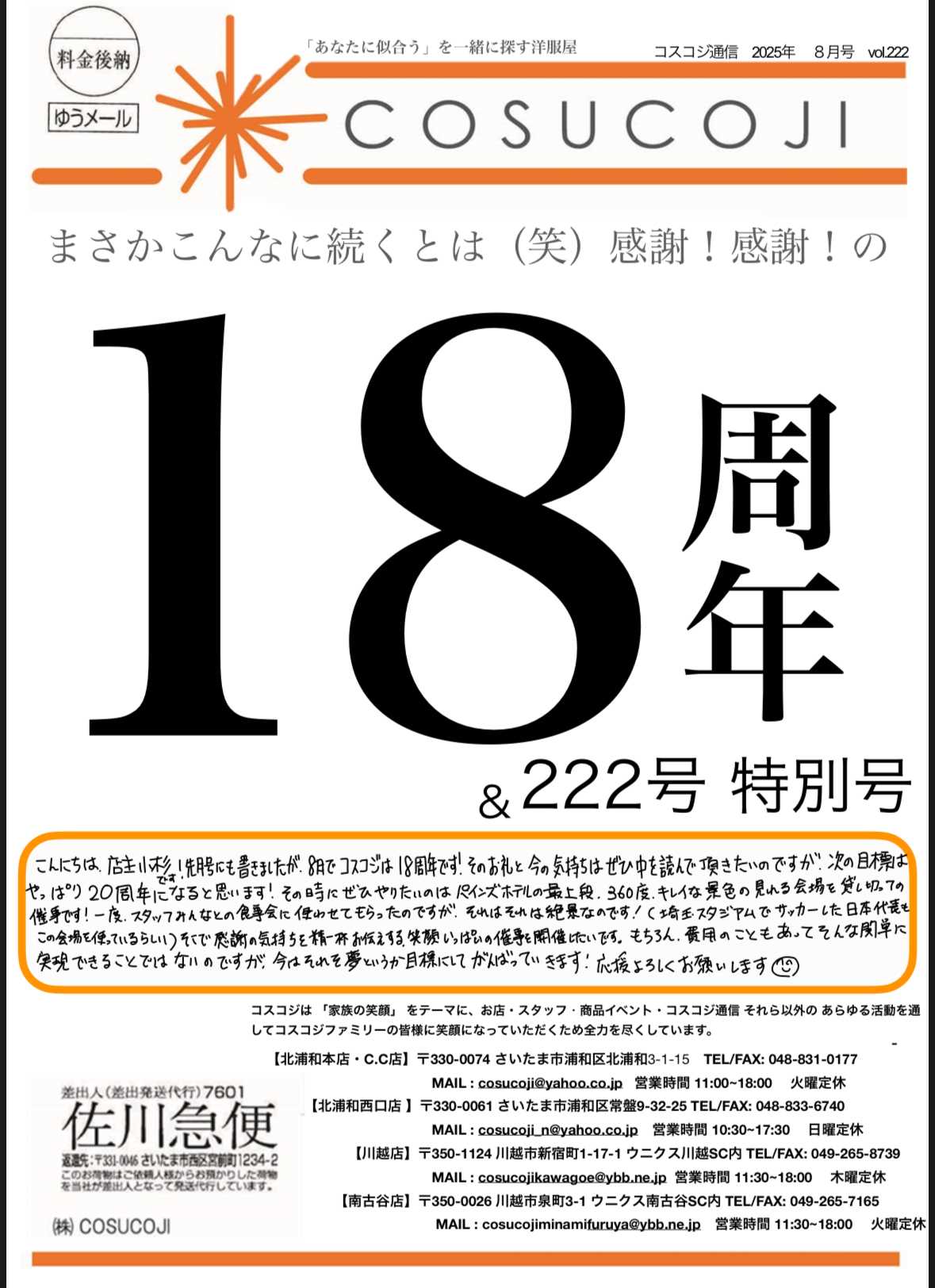 〜〜創業18周年を迎えて 〜〜いつもコスコジを温かく支えてくださる皆様、本当にありがとうございます!おかげさまで、コスコジは創業18周年という記念すべき日を迎えることができました。共に歩んでくださったお客さん、そして日々お店でがんばってくれる大切なスタッフのおかげです。心からの感謝です!私たちは2007年に北浦和で小さなお店を始めたのですが、その大きな理由は「親子の笑顔が見たいから」でした。それまでの人生で「子供と親が一緒に心から笑い合う瞬間は、人生でかけがえのない最高の時間だ」と信じていた僕は、そんな「家族の笑顔のきっかけづくり」がしたいとお店をつくったのです。でも、現実はとても厳しいものでした。オープン2日目から売上が128円しかないなど、赤字ばかりで続けることで精一杯の日々が何年もありました。そんな中でも私たちが大切にしてきたのは、お客さんがお店に足を踏み入れた瞬間から、まるで大切な友人の家に遊びに来たかのように、心からリラックスして、笑顔になれる場所でありたい、そんなあったかいお店が作りたいという思いです。コスコジはどのお店も約15坪ほどの小さなお店ですが、スタッフ一人ひとりが心を込めて選んだ、特別な洋服たちが並んでいます。私たちは、「あなたに似合う」を一緒に探し、お客さんとスタッフが「お話しながら、試着しながら、お洋服を探す時間」そのものを大切に、大事にしていきたいと思っています!18年という長い道のりを共に歩んでくださった皆様に、改めて心より感謝申し上げます。 これからもどうぞ、コスコジをよろしくお願いいたします。コスコジ 代表 小杉 光司