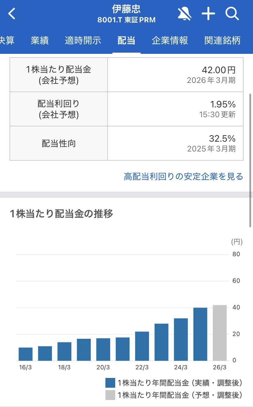 投資を始めたばかりの皆さん、普段コンビニの「ファミリーマート」を利用したり、バナナの「ドール」を食べたりしていませんか?実はこれらすべて、僕たちの持ち株である伊藤忠商事株式会社が深く関わっているビジネスなんです。2026年3月期の第3四半期決算が発表されました。資源価格に左右されにくい「非資源No.1商社」として、彼らがどのような成績を残し、僕たちの資産にどう影響するのか。その中身を熱く、冷静に紐解きます。今回の決算のポイント:非資源分野の圧倒的な安定感で「利益目標」を追撃!最新の決算動向を振り返ると、非常に頼もしい方向性が示されています。方向性としては、前年同期比で**「増収」**傾向にあります。他の総合商社が原油や石炭などの資源価格の下落で苦戦する場面でも、伊藤忠は食料、繊維、住生活といった「非資源分野」が非常に好調です。特に、国内の消費関連ビジネスが堅実に利益を積み上げており、通期の純利益目標である「8,800億円〜9,000億円」という高い壁に対しても、着実な進捗を見せていると考えられます。石井敬太社長率いる経営陣が掲げる「マーケットイン(市場の声を聴く)」の発想が、不透明な世界経済の中でも、僕たちの資産を守る盾になっている可能性があります。配当金と株主還元の動き:分割後も「実質増配」を維持する株主還元への熱意僕たち投資家にとって、最も「熱い」のが配当金の推移です。2026年3月期の配当予想は、2024年に行われた「1株→5株」の株式分割を考慮しても、実質的な増配となる計画です。最新の予想では、分割後ベースで1株あたり22円(分割前換算で110円相当)。前期の分割前換算100円から、さらに上乗せされる計算です。伊藤忠は「配当性向30%」や「1株当たり配当の下限設定」を明言しており、業績が少し足踏みしても配当を維持・増額しようとする姿勢は、まさに株主還元の鑑(かがみ)と言えます。投資初心者が注目すべきポイント:ファミリーマートから宇宙まで。多角化の安心感市場が揺れ動く時、初心者が意識すべき視点は2つあります。1. 「不況に強い」ビジネスモデルどんなに景気が悪くなっても、人はご飯を食べ、服を着て、コンビニに行きます。伊藤忠はこうした「川下(消費者側)」のビジネスに極めて強いため、資源価格の暴落といった外部ショックに強い耐性を持っています。これが、長期投資における最大の安心感に繋がると考えられます。2. 自分の資産への影響の考え方100株持っていれば、年間で数千円の配当が入ります。もしあなたが「伊藤忠の関連サービス」を利用しているなら、支払ったお金の一部が配当として自分に返ってくるようなものです。この「経済圏」の一員になる感覚こそが、投資の醍醐味です。まとめ:今回の決算をどう受け止めるか伊藤忠商事株式会社。今回の決算を通じて、彼らが「利益、ブランド、還元の3本柱」を掲げた経営方針「The Brand-new Deal」を、着実に実行していることが再確認できました。• 業績は非資源分野が牽引し、増収基調を維持。• 配当は分割後も**「実質増配」**の予想を維持。• 圧倒的な「稼ぐ力」と「守りの強さ」を両立している。断定的なことは言えませんが、日本株のポートフォリオを作る上で、伊藤忠はまさに「王道の中の王道」だと言えるのではないでしょうか。未来の自分のために。今日も一歩、冷静に、そして楽しみながら積み上げていきましょう!※この記事はあくまで参考情報です。投資を行う際は、ご自身でよく考えたうえで判断してください。▶ 大ちゃん✨保有銘柄一覧はこちら