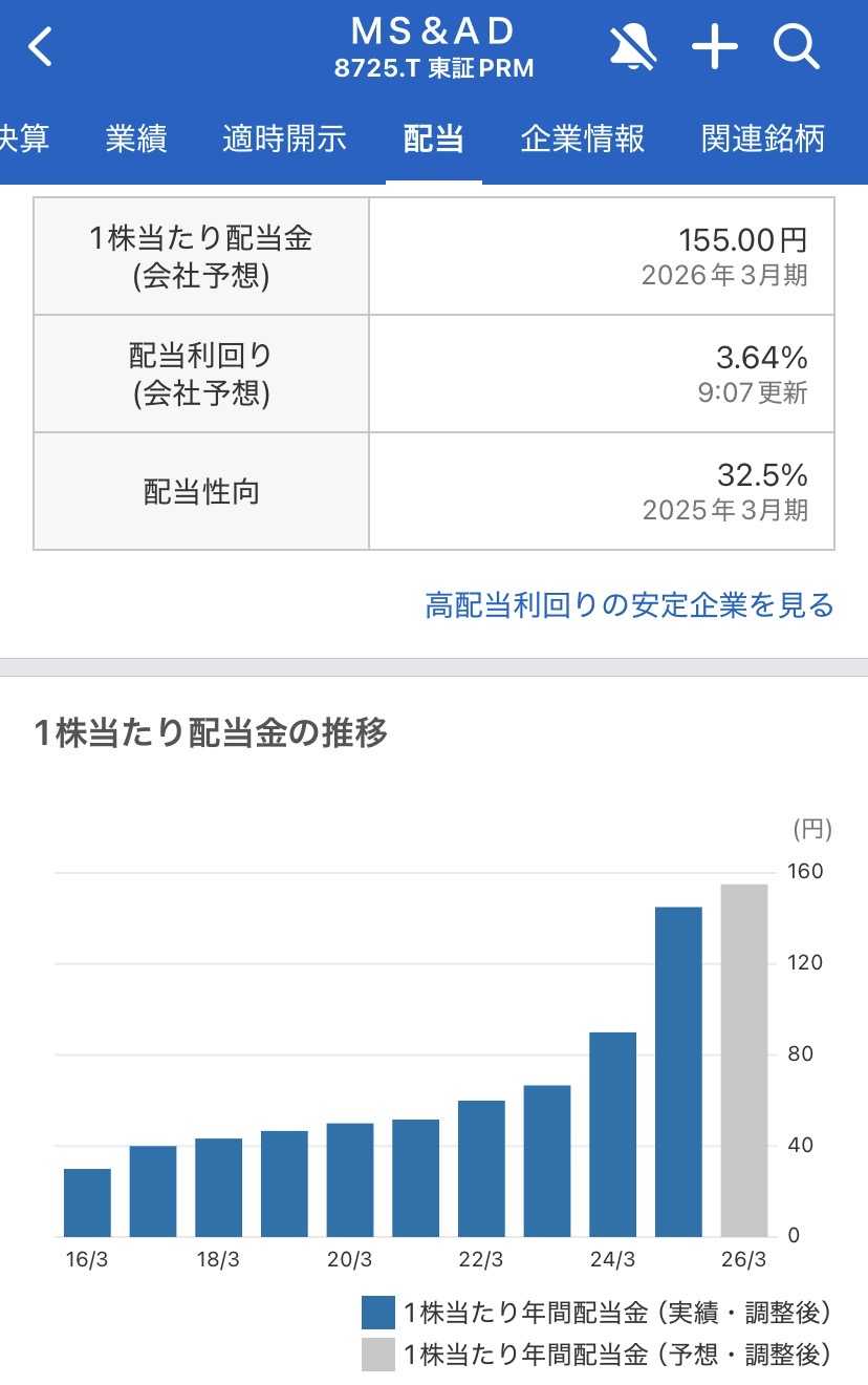 2026年3月、投資を始めた皆さんの状況はいかがでしょうか。市場は中東情勢などで揺れていますが、そんな時こそ、僕たちが保有している日本株の「還元力」をチェックする絶好の機会です。今回は、国内損保大手のMS&ADインシュアランス グループ ホールディングス株式会社(以下、MS&AD)の最新決算から、僕たちの資産に直結する「配当金」の情報を整理しました。難しい売上高や利益の数字は一旦置いておいて、一番大切な「お金の出口」に注目してみましょう。1株155円!2026年3月期の配当予想まず、投資家として最も嬉しいニュースからお伝えします。最新の発表によると、MS&ADの2026年3月期の年間配当予想は1株あたり155円となっています。これ、実はすごいことなんです。前の期(2025年3月期)の145円から、さらに10円の増配を見込んでいるということ。僕たちが100株持っていれば、年間で1万5500円(税引前)の配当金が受け取れる計算になります。新NISAの成長投資枠で持っていれば、この金額がまるまる手元に残る。これが「資産が働く」ということのリアルな手応えですよね。13期連続増配への挑戦と「累進配当」の安心感MS&ADが多くの投資初心者に支持されている理由は、その圧倒的な「継続力」にあります。もし今回の予想通りにいけば、なんと13期連続での増配を達成することになります。舩曵真一郎社長率いる経営陣は、株主還元に対して非常に積極的な姿勢を見せています。同社は、利益の状況にかかわらず配当を維持、または増額していく「累進配当」に近い考え方を掲げており、僕たちのような長期投資家にとっては、これ以上ない「心の安定剤」になってくれます。「もし大きな災害が起きたら配当が減るのでは?」と不安になるかもしれません。しかし、同社は政策保有株式(他社の株)を段階的に売却して資産を整理するなど、安定した還元を続けるための「体力作り」をしっかり進めています。自分の資産にどう影響する?この「155円」という数字は、単なるお小遣いではありません。1. 再投資による複利効果受け取った配当金をさらに別の株や投資信託に回すことで、資産の雪だるまはさらに大きく育ちます。2. インフレ対策物価が上がる時代において、企業が自ら「配当を増やしてくれる」ことは、自分自身の「給料」が増えるのと同じ効果があります。3. 精神的な支え株価が一時的に下がっても、「でも配当金は155円もらえるしな」と思えることで、パニック売りを防ぐことができます。断定はできませんが、こうした「株主を裏切らない姿勢」を持つ企業をポートフォリオの軸に置くことは、投資初心者にとって最も賢い戦略の一つと言えるのではないでしょうか。まとめMS&ADインシュアランス グループ ホールディングス株式会社。最新の状況を確認して分かったのは、彼らがどんな時も「株主と共に歩む」という強い意志を持っていることです。• 2026年3月期の配当予想は、力強い1株155円。• 13期連続増配を見込む、日本でもトップクラスの還元姿勢。• 「累進配当」の考え方が、僕たちの長期投資を支えてくれる。完璧なタイミングで売買しようと焦る必要はありません。こうした信頼できる企業を信じて、毎日少しずつ学びながら、自分のペースで資産を育てていきましょう。未来の自分のために。今日も一歩、冷静に積み上げていきましょう!▶ 大ちゃん✨保有銘柄一覧はこちら