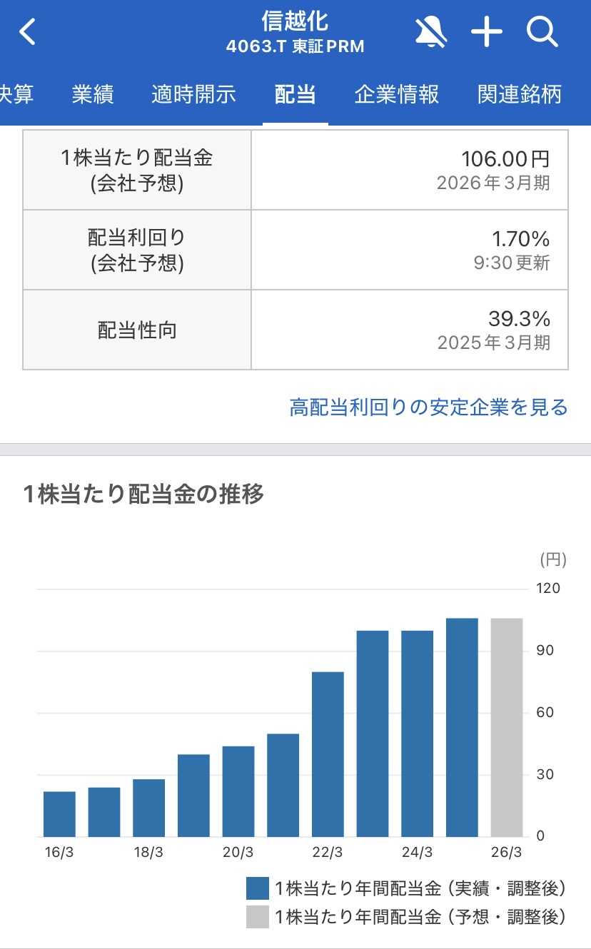 投資を始めたばかりの皆さん、スマホやパソコン、そして最近話題のAI。これらすべてに欠かせない「素材」を世界中に届けている日本企業があるのをご存知ですか?それが、僕たちの持ち株でもある信越化学工業株式会社です。世界経済が複雑に動く2026年。この「素材の巨人」が発表した最新の決算(第3四半期累計)から、僕たちのお金(資産)への影響を読み解いていきましょう。今回の決算のポイント:電子材料は「底入れ」からAI市場の拡大へ最新の決算発表を振り返ると、非常に興味深い「変化のサイン」が見えてきます。方向性としては、売上高は前年同期比で**「微増」、利益面では前年同期比で「減益」**という結果になりました。これだけ聞くと不安になるかもしれませんが、中身はとても前向きです。特に、僕たちが注目すべきは「電子材料(半導体シリコンなど)」の分野です。斉藤恭彦社長は決算説明の中で、スマートフォンなどの従来分野が「ようやく底入れした」との見方を示しました。一方で、AI(人工知能)関連市場の拡大に伴い、先端分野の需要は引き続き好調を維持しています。主力の「生活環境基盤材料(塩化ビニルなど)」は、中国の市場動向などの影響で厳しい局面もありましたが、全体としては通期予想に対して着実に進捗していると考えられます。配当金と株主還元の動き:1株106円予想!安定した「還元」が心の支えに投資初心者の僕たちにとって、最も頼もしいのが信越化学の「還元姿勢」です。2026年3月期の年間配当予想は、1株あたり106円となっています。前期(2025年3月期)の100円から6円の増配を見込む、非常に力強い計画です。もし100株持っていれば、年間で1万600円(税引前)の配当が届く計算になります。新NISAで保有していれば、その全額が自分の手元に残る。これが「超優良株」を持つ醍醐味ですよね。同社は「利益はまず成長のための再投資に使い、それと両輪で配当も安定的に行う」という方針を貫いています。一時的な業績の波に左右されず、株主に報いようとする姿勢は、長期投資における大きな安心材料になると考えられます。投資初心者が注目すべきポイント:世界シェア1位という「最強の守り」市場が乱高下する時、僕たちは何を信じればいいのでしょうか。1. 「代えが利かない」強み信越化学が作る半導体シリコンや塩化ビニルは、世界シェア1位。世界中のメーカーが、信越化学の製品がないと仕事にならないという状態です。この「圧倒的な競争力」こそが、不況時でも会社が潰れず、利益を出し続けられる最大の理由と考えられます。2. 自分の資産への影響の考え方株価が短期的に下がることはあっても、同社が手がける「AI」や「インフラ」というテーマは、これからの世界にますます必要とされるものです。目先の数字に一喜一憂せず、世界一の技術を持つ企業の「オーナー(株主)」であるという誇りを持つことが、資産を大きく育てる秘訣かもしれません。まとめ:今回の決算をどう受け止めるか信越化学工業株式会社。今回の決算を通じて、彼らが時代の変化(AI革命)をしっかりと捉え、次の成長に向けて着実に歩みを進めていることが再確認できました。• 業績は「底入れ」を確認。AI関連が新たな成長のエンジンに。• 1株106円の配当予想は、株主を大切にする信頼の証。• 世界トップシェアの製品群が、僕たちの資産を守る盾になる。断定的なことは言えませんが、日本株のポートフォリオを作る上で、信越化学はまさに「外せない中心選手」だと言えるのではないでしょうか。未来の自分のために。今日も一歩、冷静に、そして誇りを持って積み上げていきましょう!▶ 大ちゃん✨保有銘柄一覧はこちら