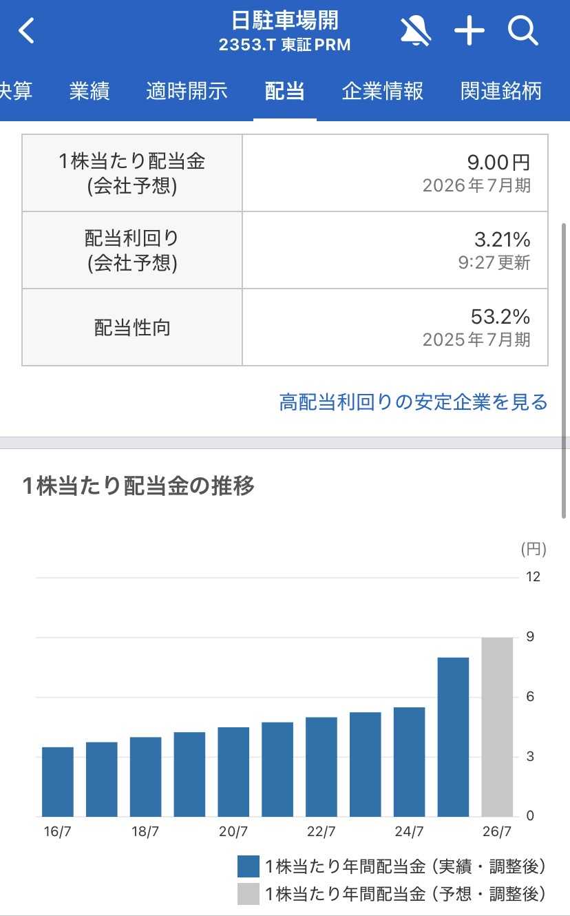 投資を始めたばかりの皆さん、毎日使う「駐車場」が利益を生み出す仕組みを考えたことはありますか?今回は、僕たちが普段目にする風景の中にビジネスチャンスを見出している日本駐車場開発株式会社の最新決算を紐解いていきましょう。この企業は、ただ駐車場を運営するだけでなく、スキー場やテーマパークの再生など、ユニークな事業展開で知られています。今回の決算が、僕たちの資産にどんな未来を見せてくれるのか解説します。今回の決算のポイント:駐車場×スキー場。多角化で見せる「増収」の勢い2026年3月に発表される第2四半期決算の方向性を見ると、非常にポジティブな兆しが感じられます。方向性としては、前年同期比で**「増収」傾向にあります。主力の駐車場事業では、都市部の人流回復やカーシェアリング需要の取り込みが順調です。さらに、同社が手掛けるスキー場事業(日本スキー場開発株式会社)も、インバウンド(訪日外国人)の増加や冬のレジャー需要の回復により、前年同期比で「業績の改善」**に大きく貢献していると考えられます。巽一樹社長率いる経営陣は、不稼働資産を収益化するノウハウに長けており、今のインフレ局面でも柔軟にサービス価格を調整することで、利益を確保する動きを見せています。配当金と株主還元の動き:圧巻の16期連続増配へ!「1株9円」の予想投資初心者にとって、この銘柄最大の魅力はその「配当の伸び」です。最新の予想によると、2026年7月期の年間配当は1株あたり9円。前期(2025年7月期)の8円からさらに1円の増配となる見込みです。これが実現すれば、なんと**「16期連続の増配」**という、驚異的な記録となります。同社は「配当性向」を意識しつつも、株主への還元を最優先に考える姿勢が非常に強いです。15年前と比べると配当額は約8倍にまで成長しており、まさに「持っているだけで資産が育つ」を体現している企業と言えるのではないでしょうか。投資初心者が注目すべきポイント:3万円以下で買える「最強の練習銘柄」市場が荒れている時こそ、この銘柄の「手軽さ」が武器になります。1. 圧倒的な「買いやすさ」株価が200円〜300円前後(2026年3月時点)で推移しているため、100株買っても3万円弱で済みます。新NISAの成長投資枠で「まずは個別株を体験してみたい」という方にとって、これほどリスクを抑えて連続増配の恩恵を受けられる銘柄は貴重です。2. 自分の資産への影響の考え方配当利回りも3%を超えてくる水準(株価による)であり、銀行に預けておくよりもはるかに効率的に資産を働かせることができます。株価が下がったとしても、こうした「少額で買える増配株」をコツコツ買い増すことで、将来の大きな入金力に繋がる可能性があります。まとめ:今回の決算をどう受け止めるか日本駐車場開発株式会社。今回の決算を通じて、彼らの「遊休資産を宝に変える」ビジネスモデルが、今の時代にいかにマッチしているかが再確認できました。• 業績は駐車場とスキー場の両輪で、増収基調と改善が期待できる。• 1株9円の配当予想は、16期連続増配という信頼の証。• 3万円以下で投資できる「初心者への優しさ」と「成長性」の両立。断定的なことは言えませんが、インフレに強く、かつ株主を大切にする同社の姿勢は、僕たちが長期で資産を築くための「最初の一歩」にふさわしい銘柄だと考えられます。未来の自分のために。今日も一歩、冷静に、そして楽しみながら積み上げていきましょう!▶ 大ちゃん✨保有銘柄一覧はこちら
