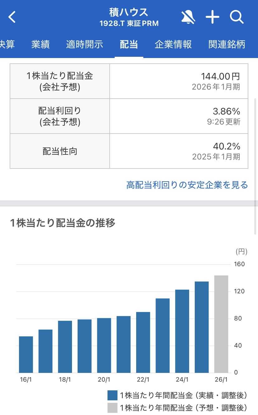 投資を始めたばかりの皆さん、自分の持っている企業が「どこで、どうやって稼いでいるか」をイメージしたことはありますか?今回は、僕たちの持ち株の中でも安定感抜群の積水ハウス株式会社の最新決算を紐解いていきます。景気の波に左右されやすいイメージがある住宅業界ですが、この企業は今、これまでの常識を塗り替えるような成長を遂げています。その中身を、僕たちのお金(資産)への影響を中心に解説します。今回の決算のポイント:国内の安定と「海外の飛躍」で増収基調を維持最新の決算動向を振り返ると、非常に頼もしい方向性が示されています。方向性としては、前年同期比で**「増収」**を達成。特に注目すべきは、アメリカを中心とした「海外ビジネス」の急成長です。大型の買収(MDC社の連結化など)が功を奏し、収益の柱が日本国内だけでなく世界へと広がっています。一方で、原材料費の上昇や円安の影響など、コスト面の負担もゼロではありません。しかし、高付加価値な住宅の提供や、賃貸住宅管理といった「ストック型ビジネス」が支えとなり、全体として**「前年同期比で改善」**を見せるなど、底堅い業績を維持しています。阿部俊則会長や仲井嘉浩社長が進める「グローバルな環境創造」という戦略が、着実に形になっていると考えられます。配当金と株主還元の動き:圧巻の14期連続増配!1株144円の重み僕たち投資家にとって、最も誇らしいのがその「還元姿勢」です。最新の予想によると、2026年1月期の年間配当は1株あたり144円。これは前の期の135円から9円の増配となる計画です。この予想が達成されれば、なんと**「14期連続の増配」**となります。同社は中期経営計画において「配当性向40%以上」を掲げるとともに、利益が成長する限り配当も増やし続ける姿勢を鮮明にしています。この「144円」という数字は、僕たちが100株持っていれば、年間で1万4400円(税引前)が届くということ。新NISAで保有していれば、その果実をまるまる享受できる可能性があります。投資初心者が注目すべきポイント:単なる「住宅メーカー」ではない強み市場が揺れ動く時、初心者が意識すべき視点は2つあります。1. 収益源の「分散」が効いている積水ハウスは「建てる」だけではありません。賃貸住宅の管理(不動産フィー事業)や、リフォーム事業といった、景気に左右されにくい「ストック型」の収益が利益の大きな割合を占めています。これが、暴落時でも配当を出し続けられる「強さの秘密」と考えられます。2. 自分の資産への影響の考え方株価が短期的に数%下がったとしても、企業の「稼ぐ仕組み」が壊れていない限り、それは一時的な波に過ぎません。「家という生活の基盤」を扱っている企業は、社会から必要とされ続けるため、長期投資の「大黒柱」として機能してくれる可能性があります。まとめ:今回の決算をどう受け止めるか積水ハウス株式会社。今回の決算を通じて、彼らが日本国内に留まらず、世界中の「住まい」を支えるグローバル企業へと進化していることが再確認できました。• 業績は海外戦略が当たり、増収基調で力強い。• 1株144円の配当予想は、14期連続増配という信頼の証。• 「建てる」から「支える」へ。多角化された収益源が長期投資の安心感を生む。断定的なことは言えませんが、どんなに時代が変わっても、人が「住む場所」を求める気持ちは変わりません。こうした確かな需要に応え続ける企業を信じて、一喜一憂せずにじっくりと持ち続けていきましょう。未来の自分のために。今日も一歩、冷静に積み上げていきましょう!▶ 大ちゃん✨保有銘柄一覧はこちら