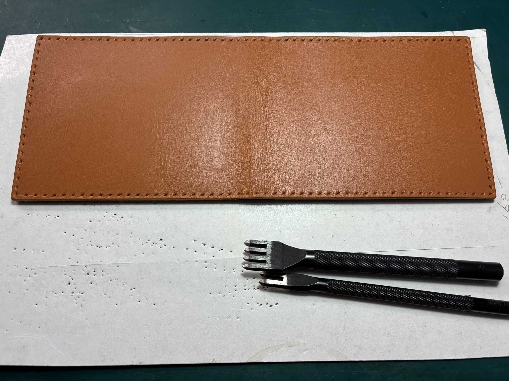 背当て革に手縫い穴をあけ、縫います。物入れ部分の脇を、出来上がり線で切り落としました。