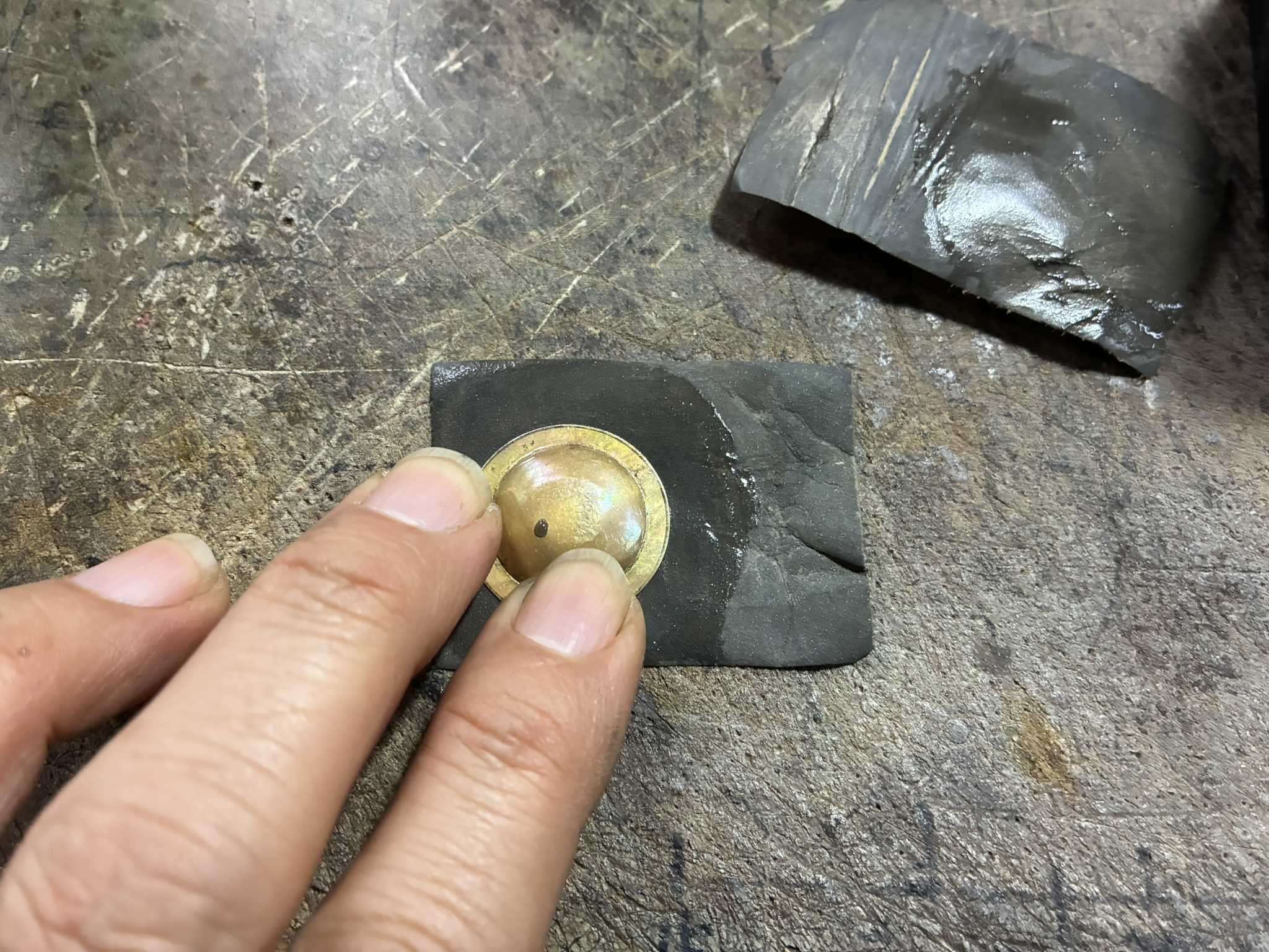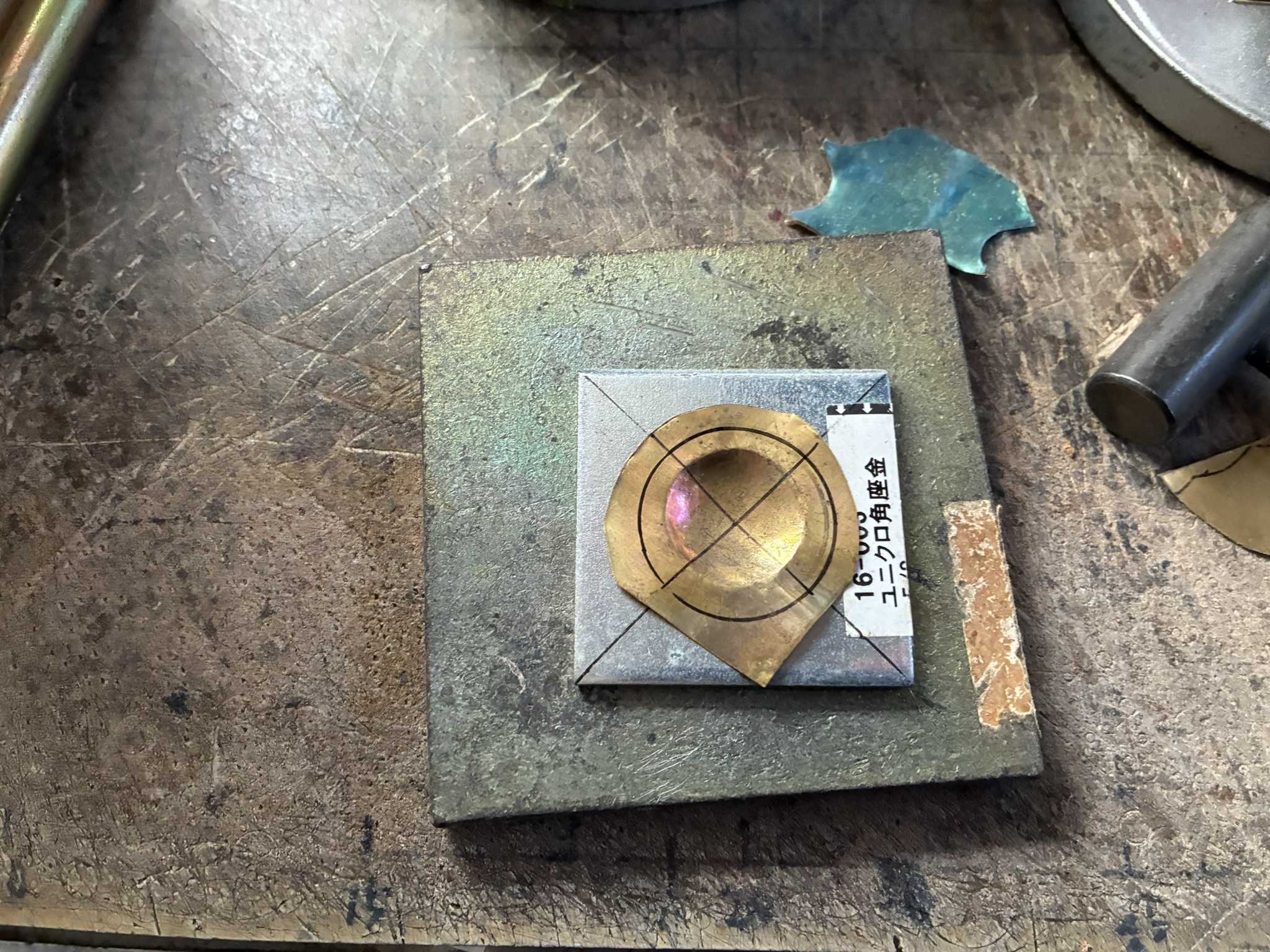真鍮板でミニチュアの皿を作ります。焼きなました真鍮板を座金の穴の上に置き、叩く面が丸い金槌で少しずつたたきます。大分丸くなってきました。余分なところを切り落としました。ヤスリをかけて滑らかにします。