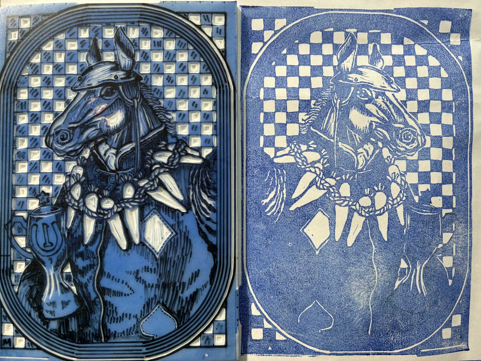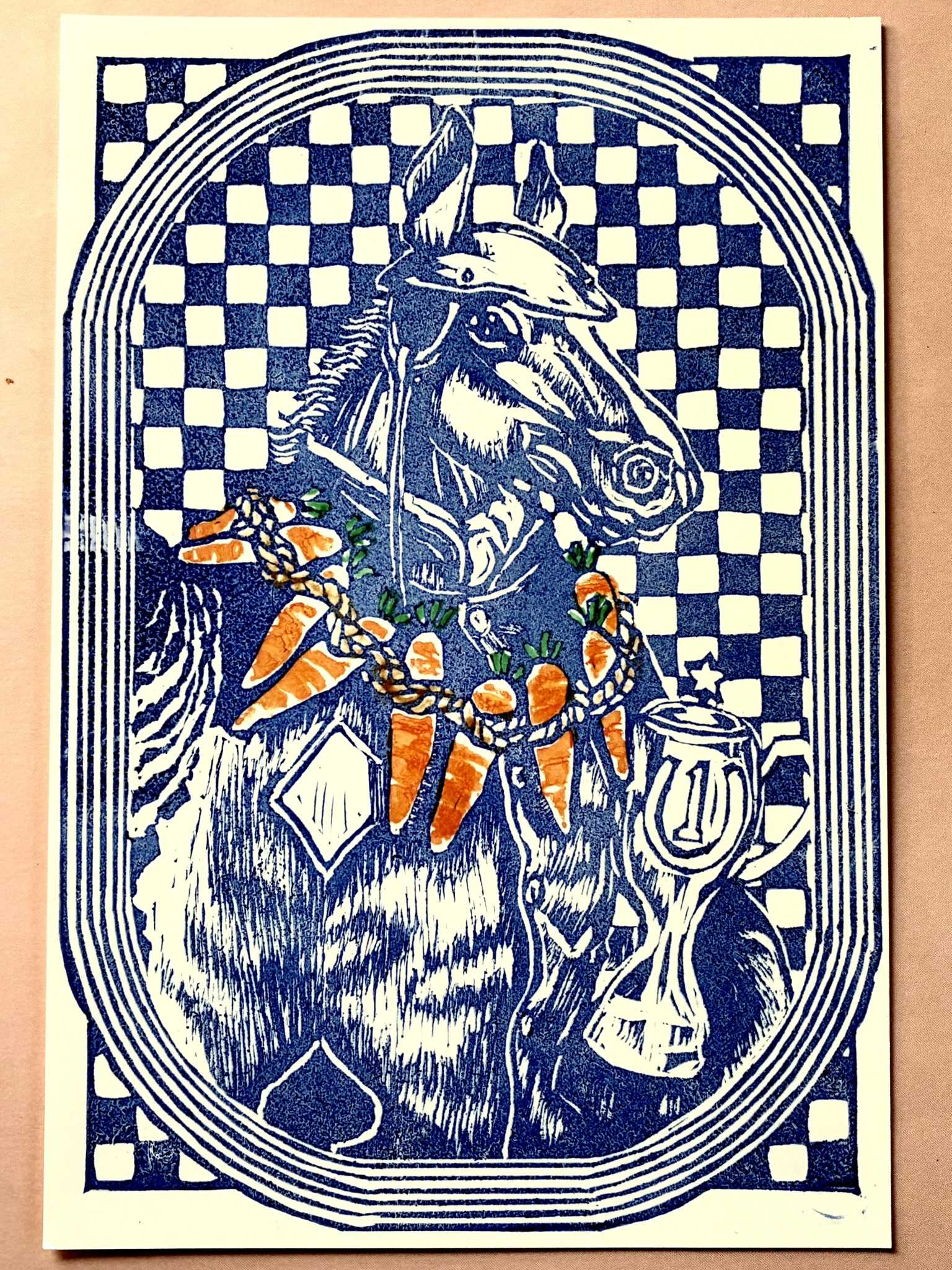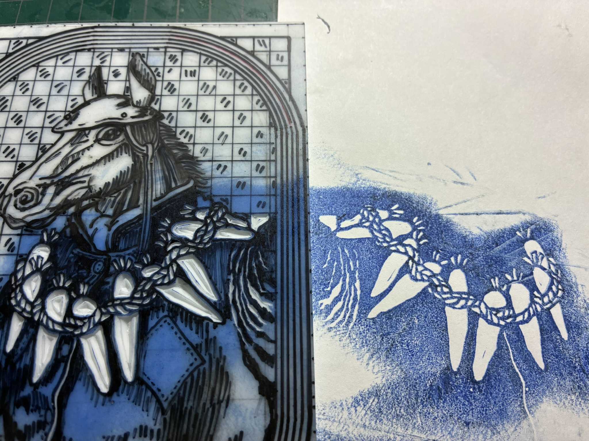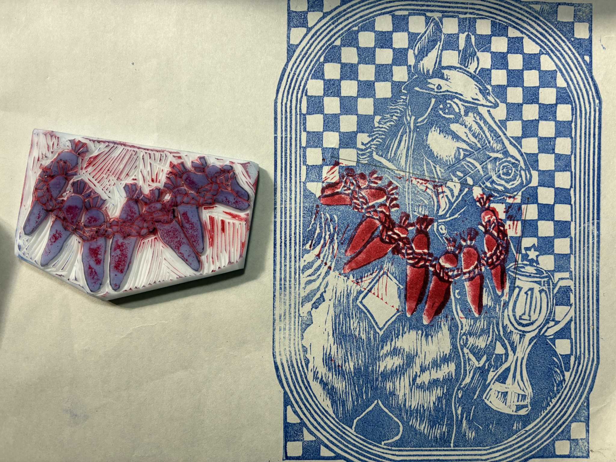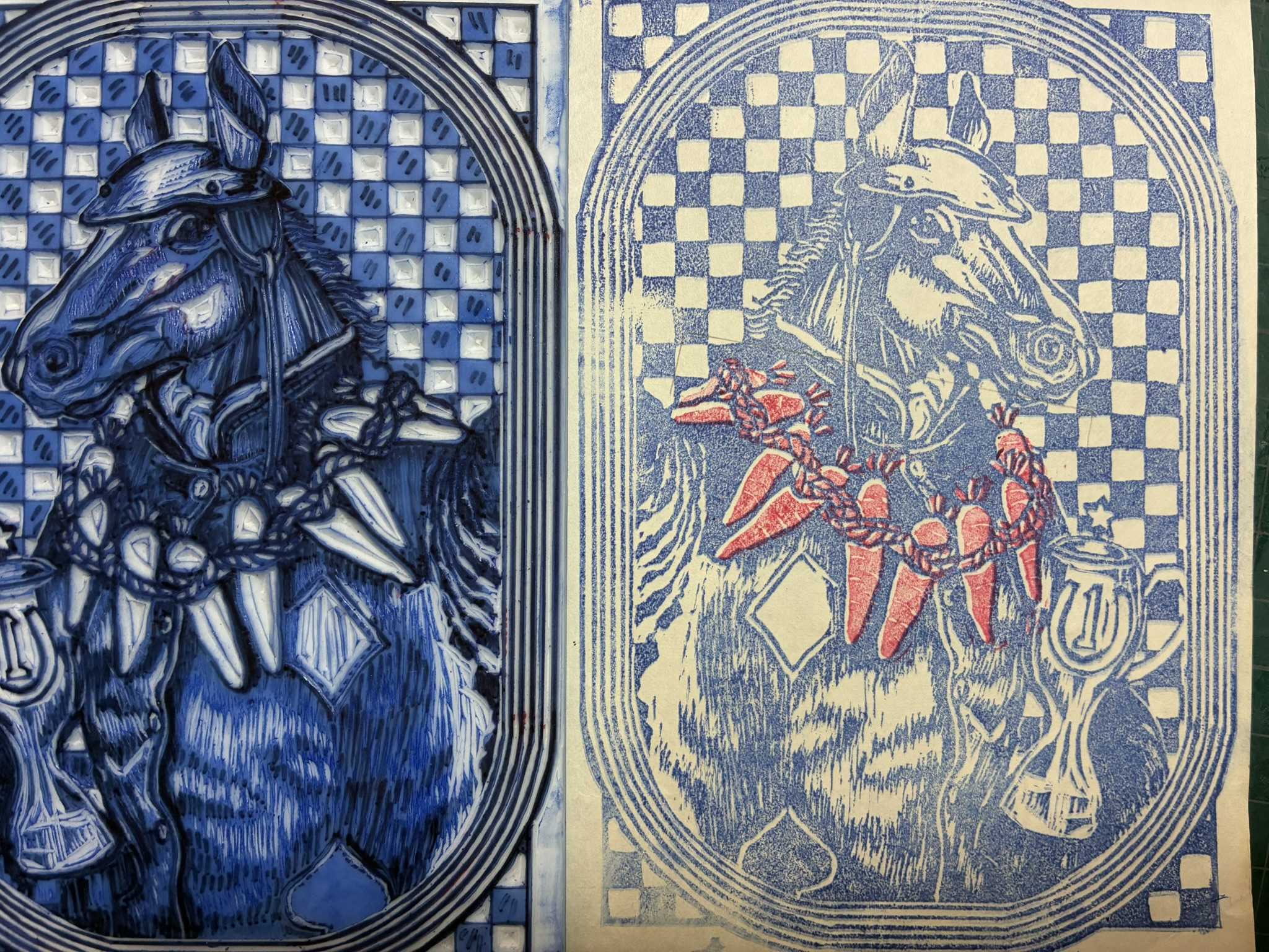 馬の版画に重ねて刷りました。重ね刷りはずれやすいので、少しニンジンを細目にしたいと思います。ニンジンを少し削ります。少し白いところが出るようにしました。