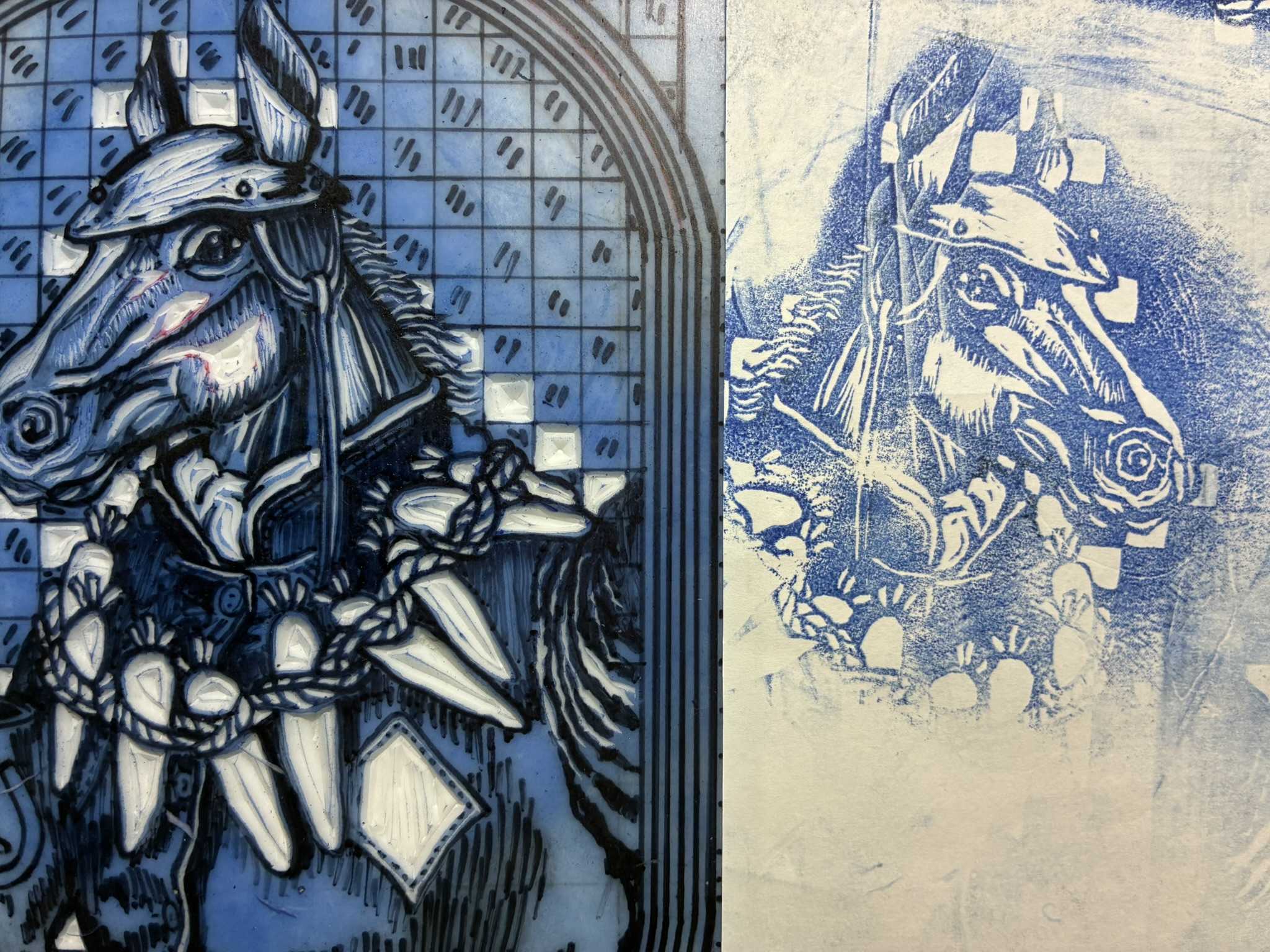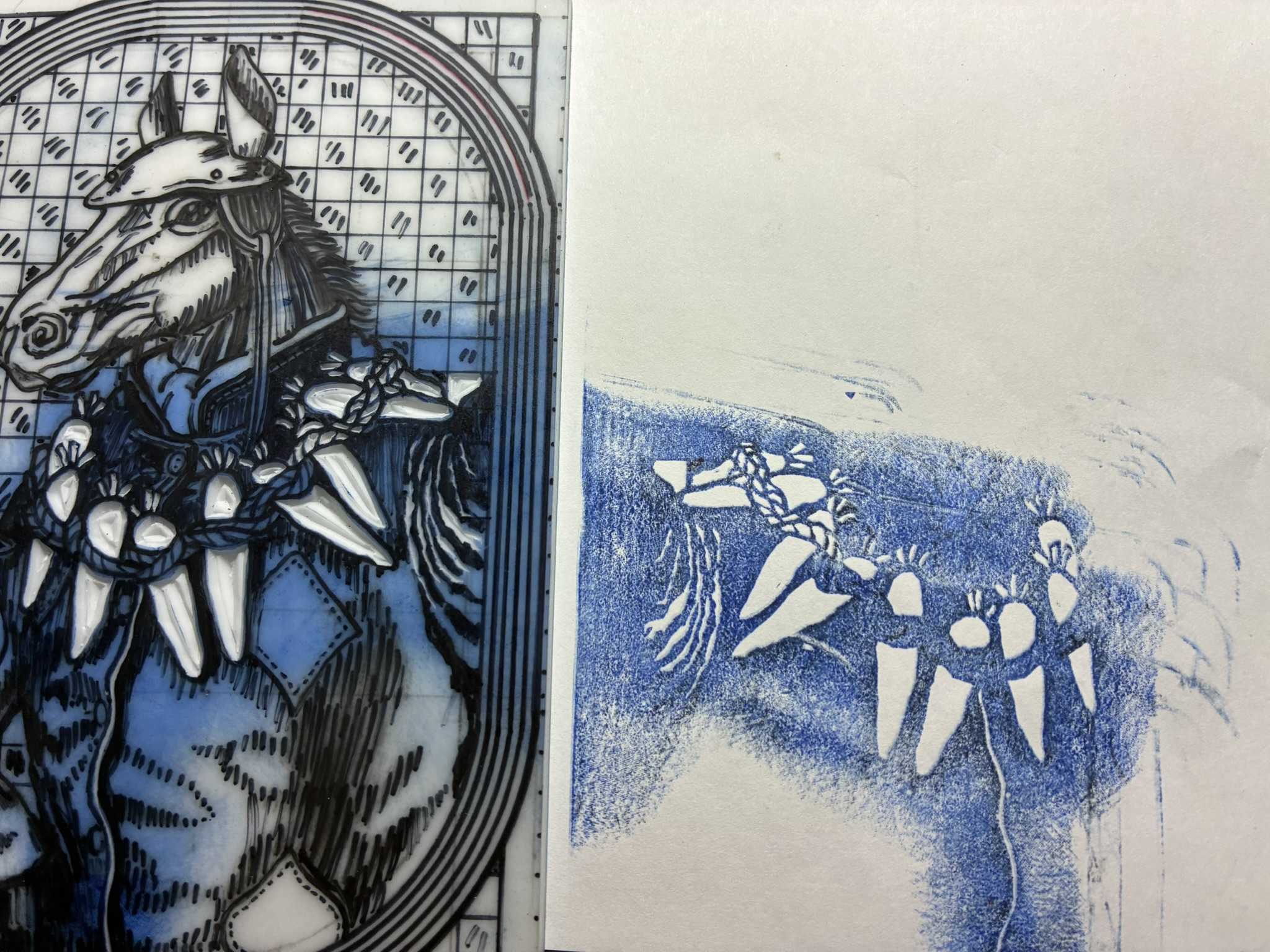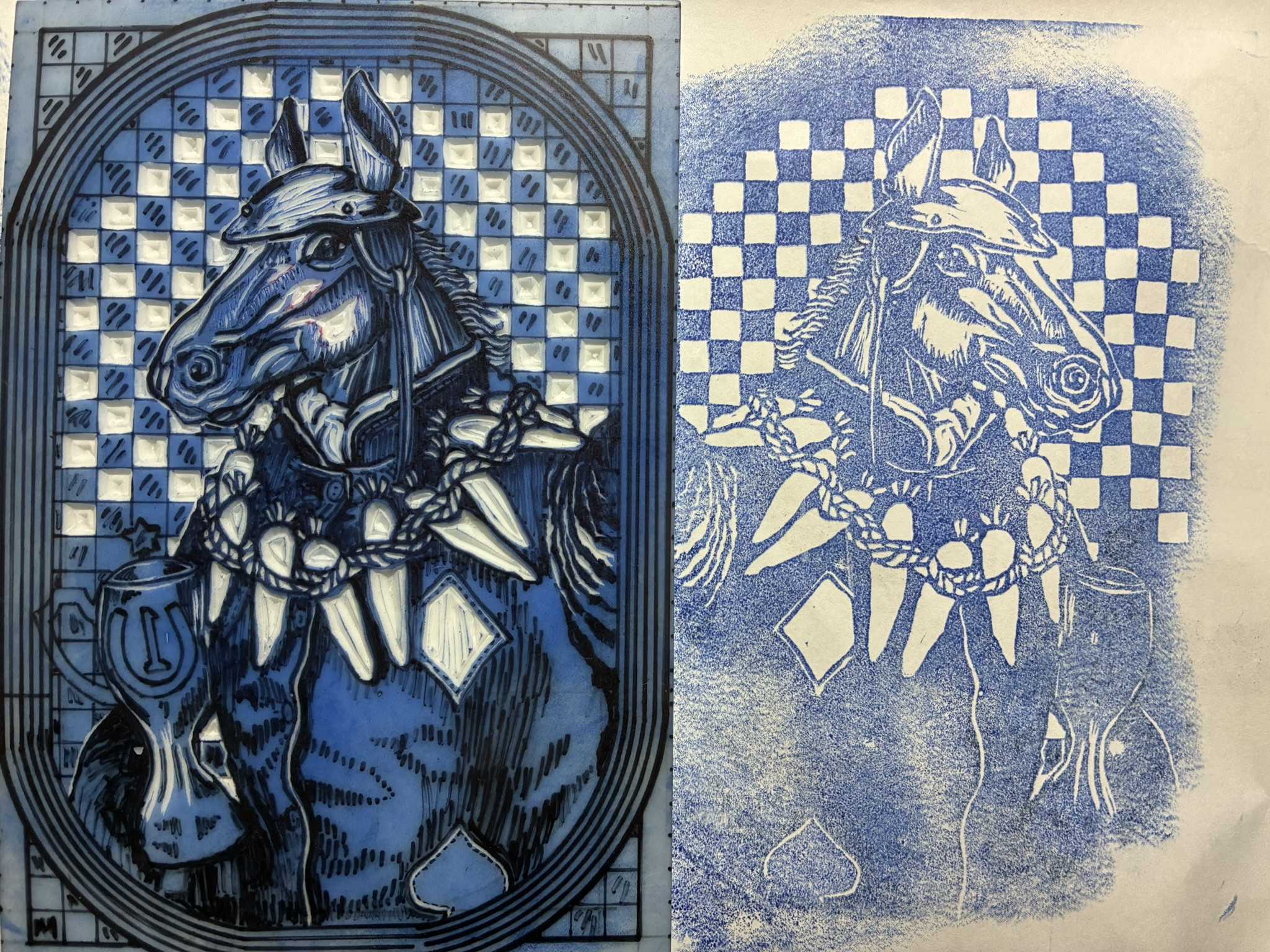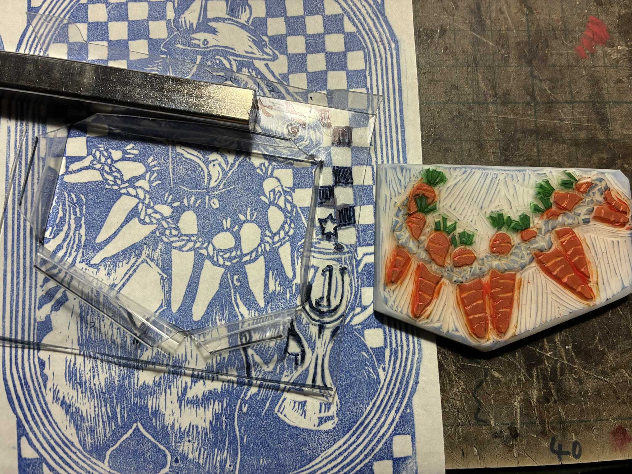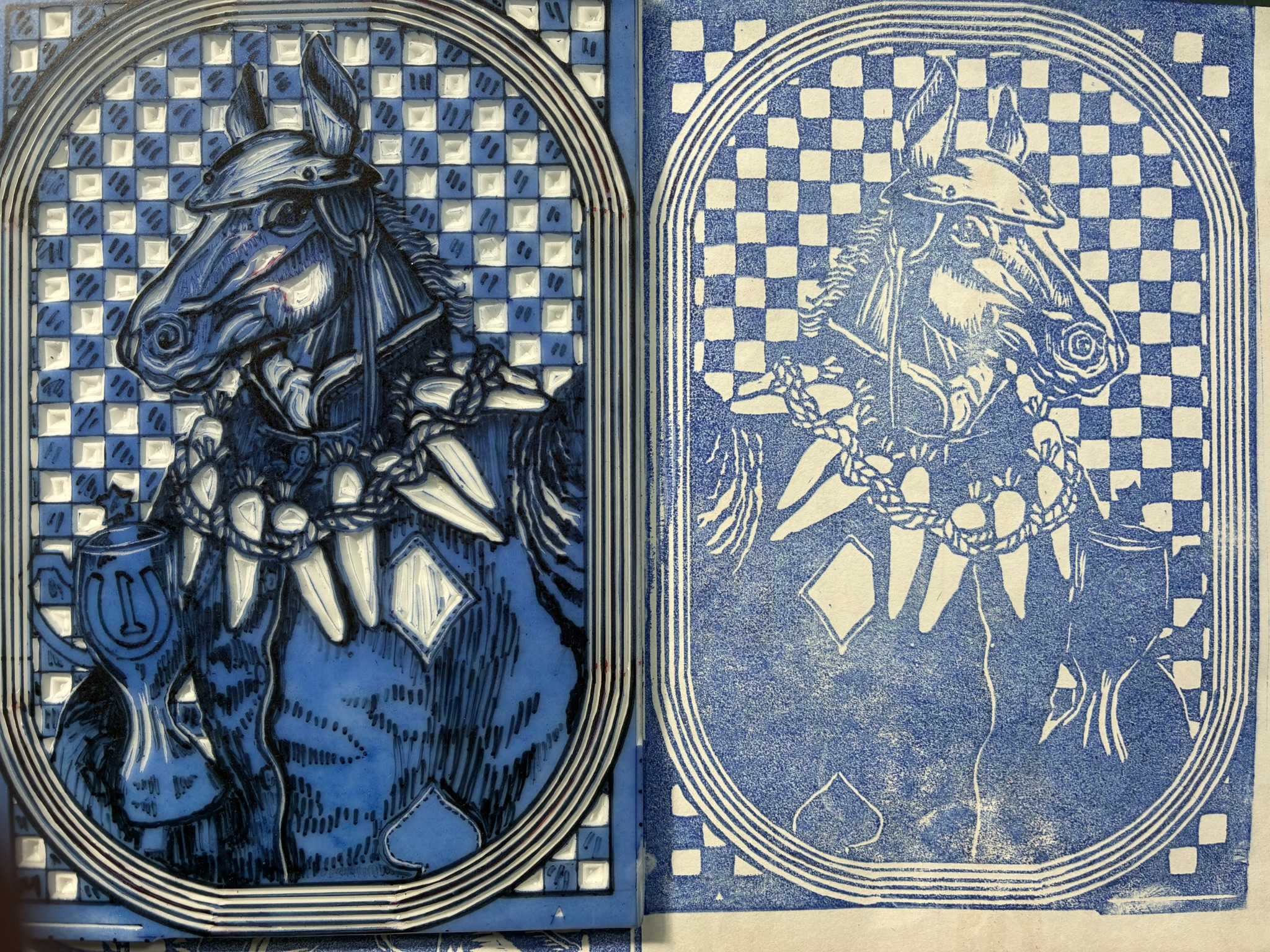 馬の版画に重ねて刷りました。重ね刷りはずれやすいので、少しニンジンを細目にしたいと思います。ニンジンを少し削ります。少し白いところが出るようにしました。