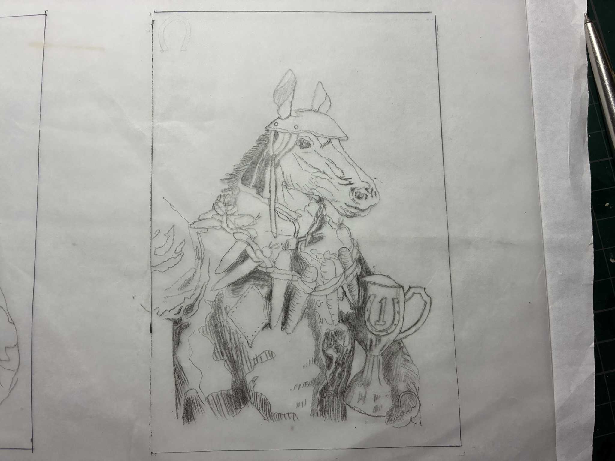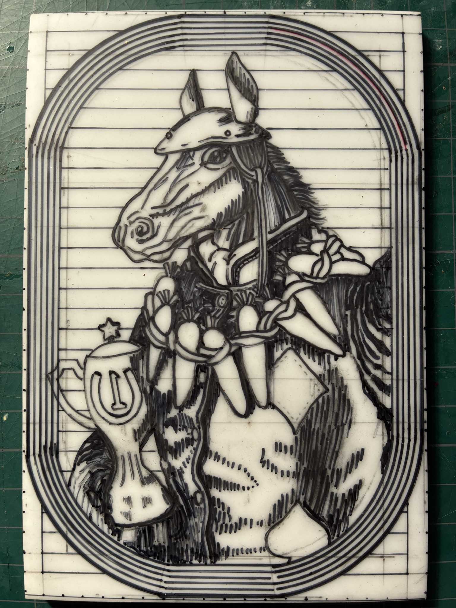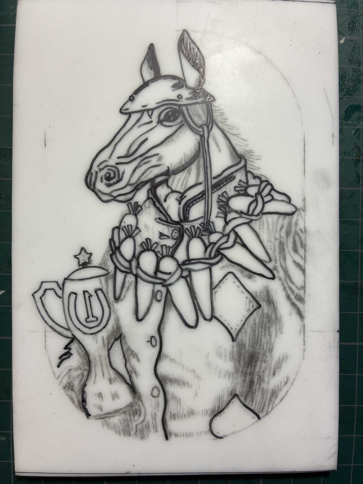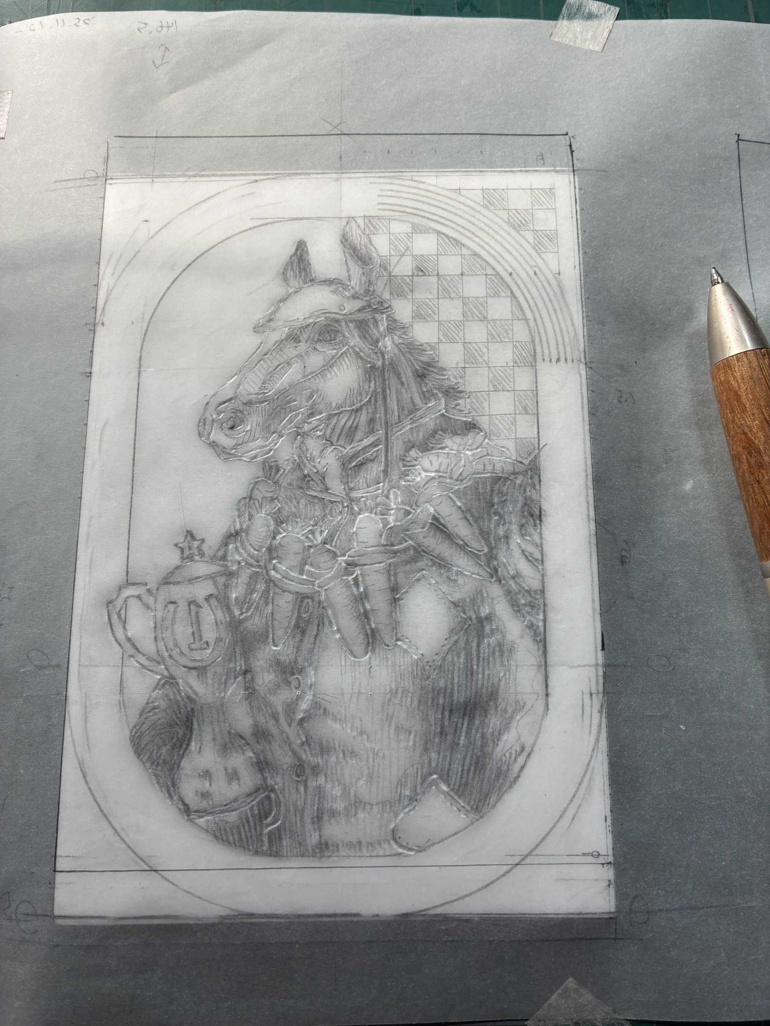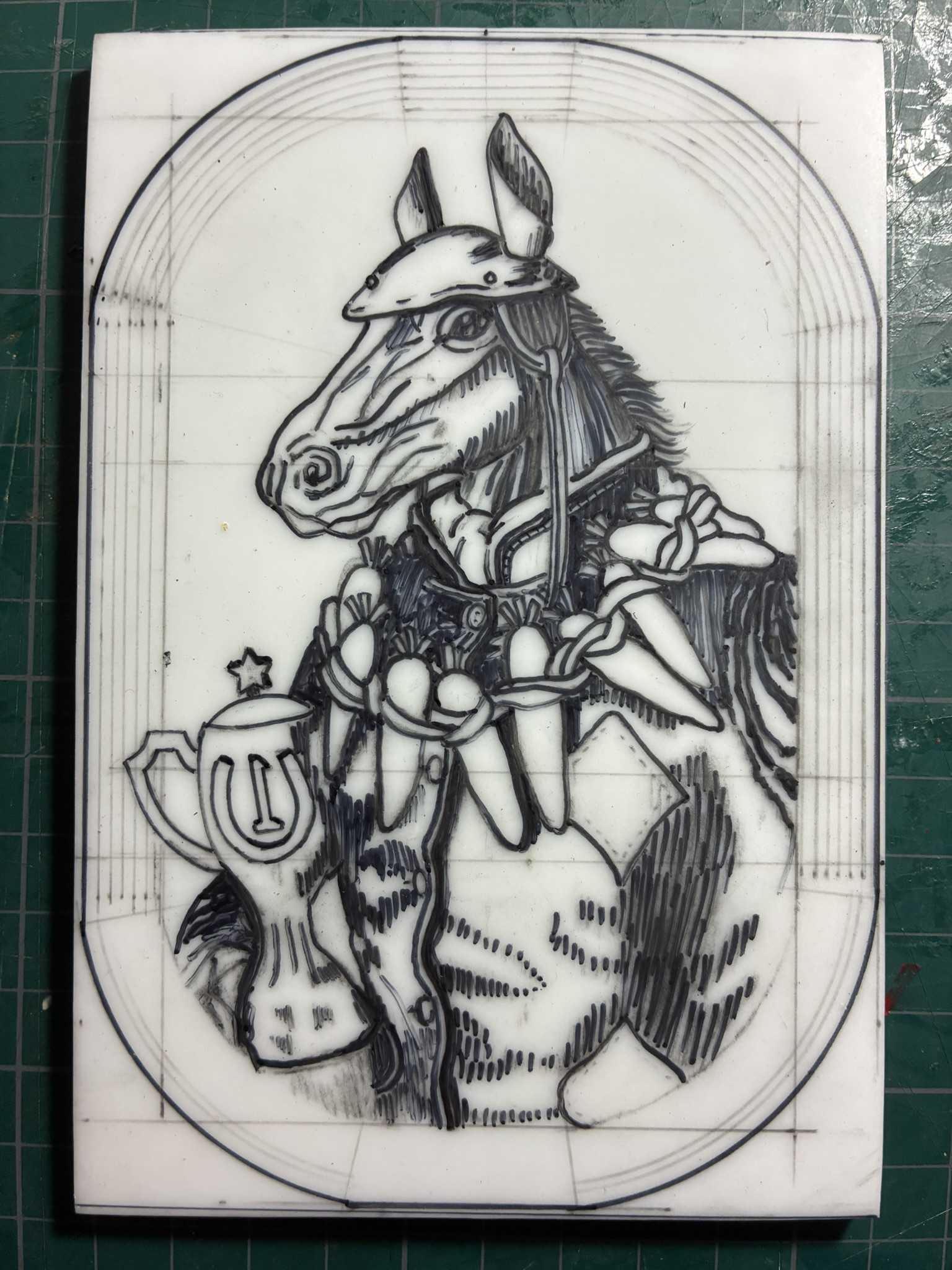 トレーシングペーパーに描いた下絵をなぞって、消しゴム板に転写します。馬の絵を転写できました。