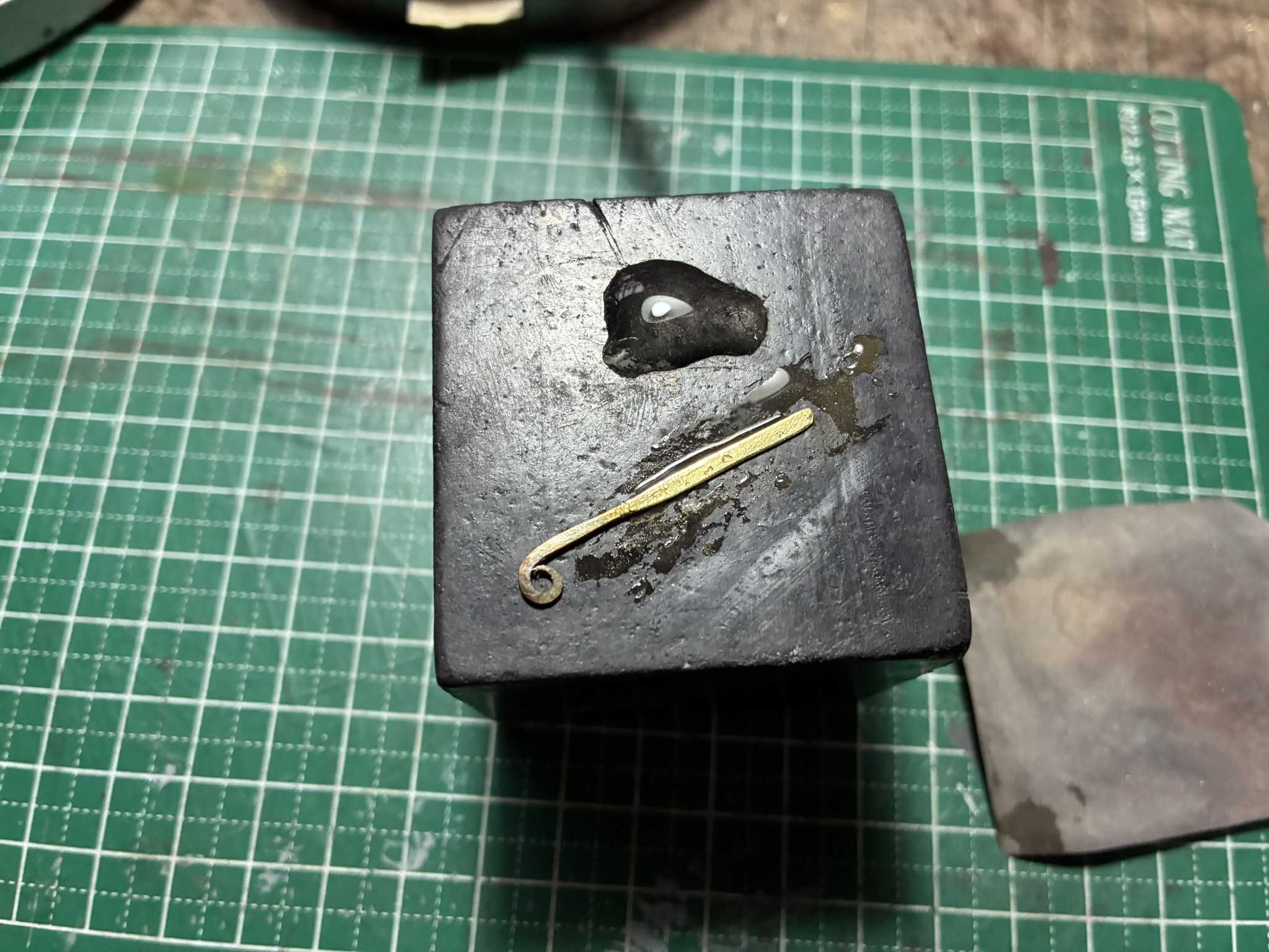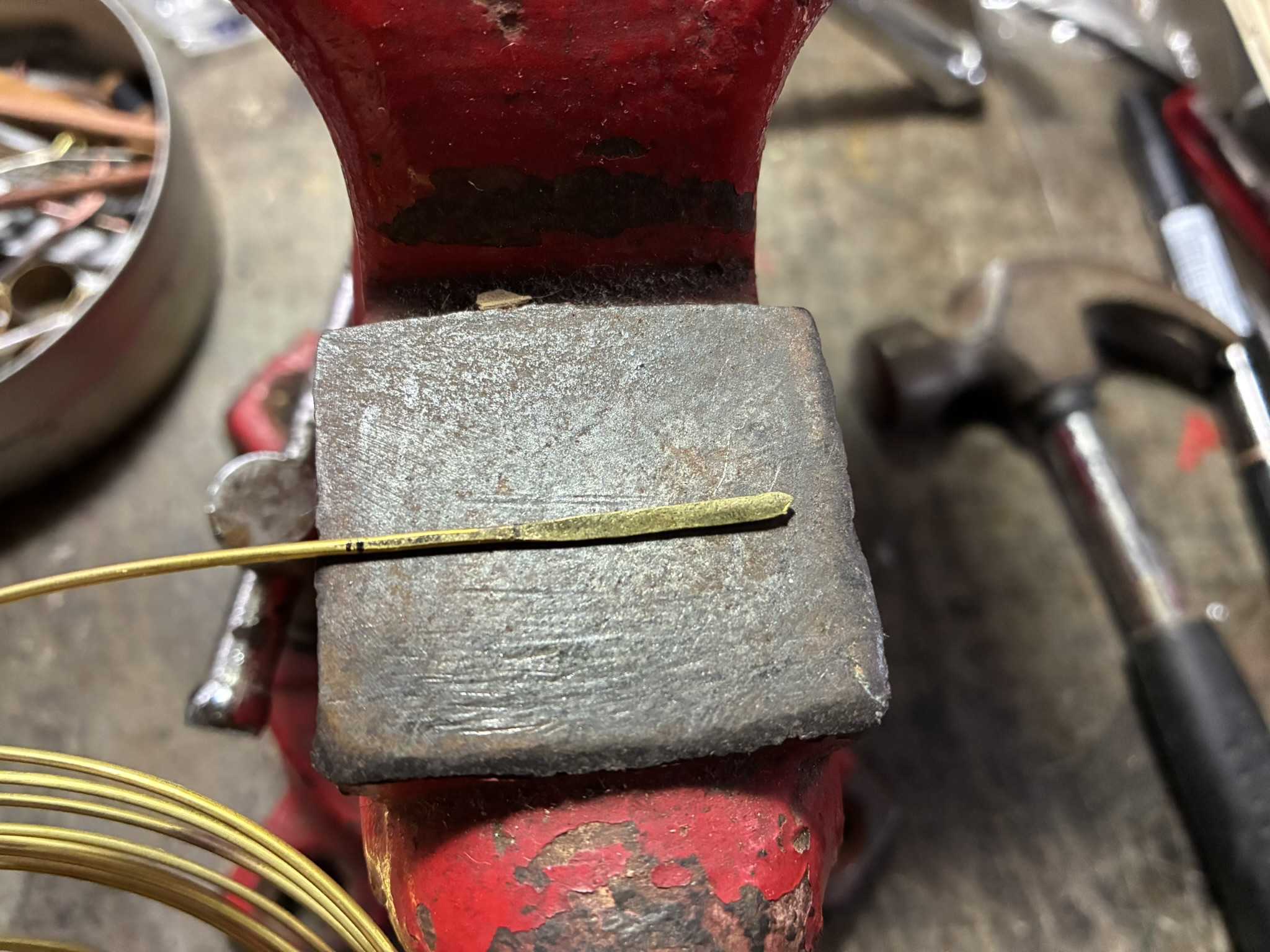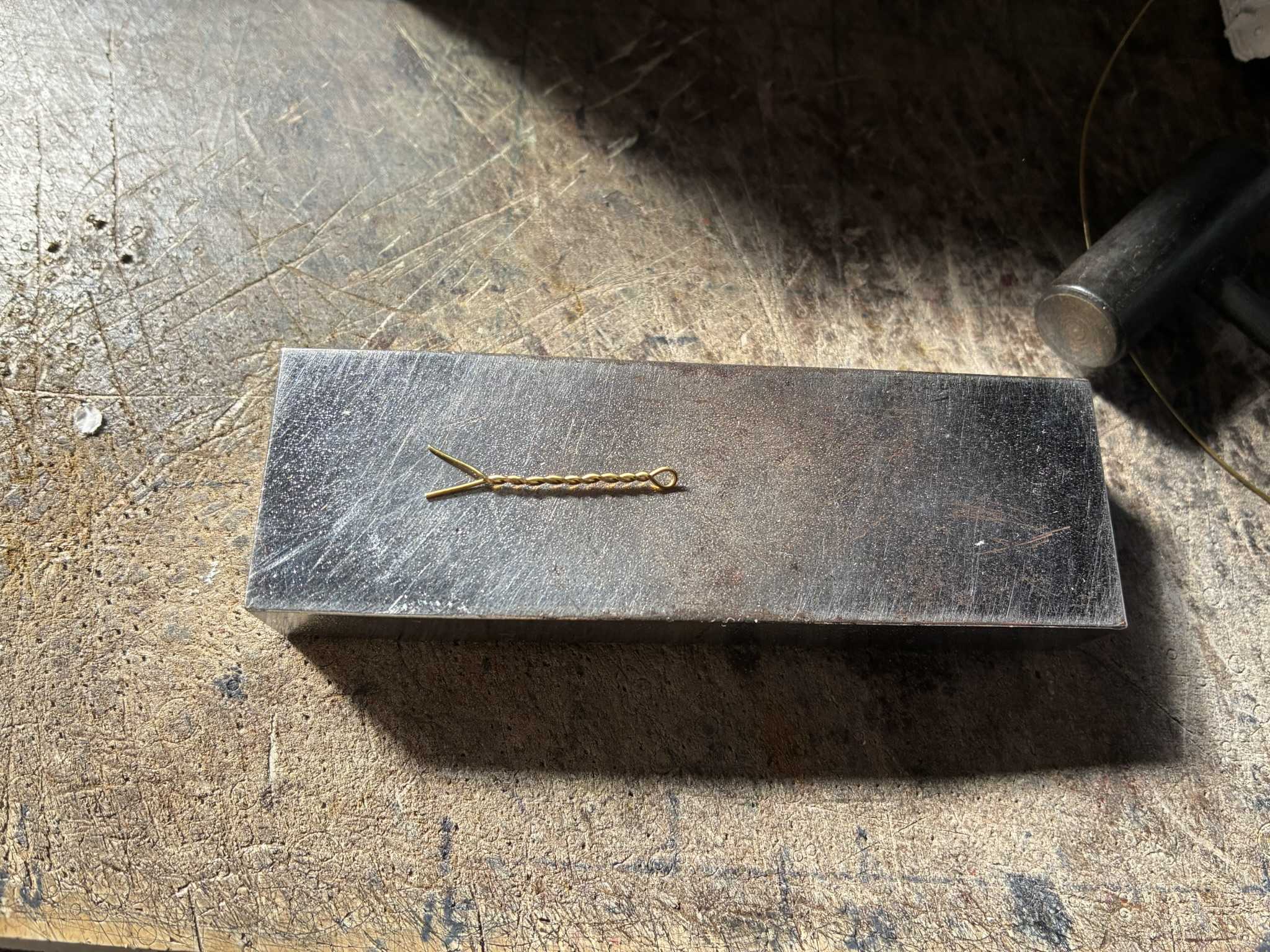 真鍮線を叩いてナイフを作ります。切り離して、叩いて、ヤスリで修正します。柄の端を叩いて、丸めました。