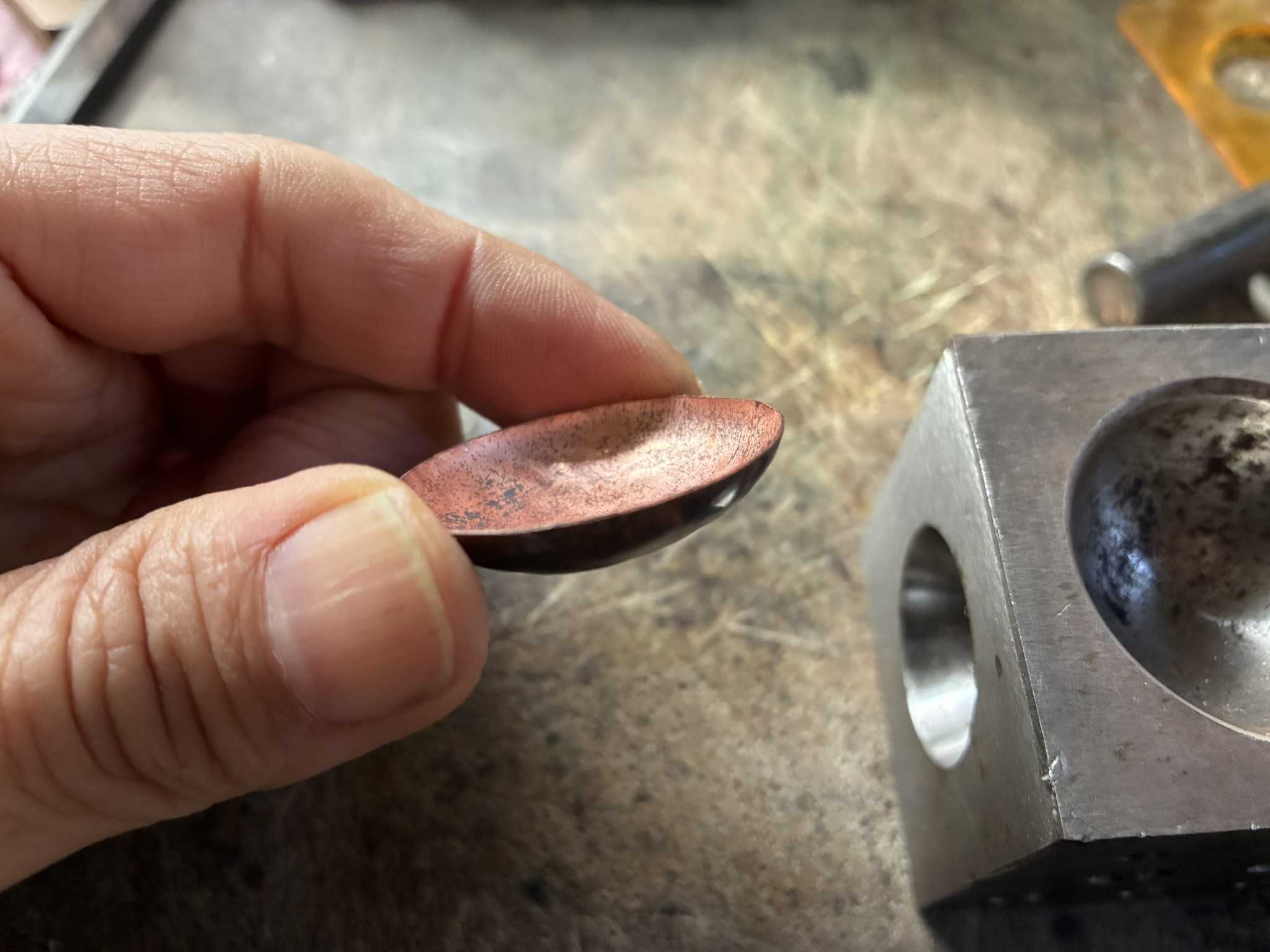 焼きなました銅板を軽くたたき続けて、すぐに丸みを帯びてきました。銅板を4分割して数字を振り、まんべんなくたたきます。大分丸くなってきましたが、斑があるのでそこを意識して叩きます。