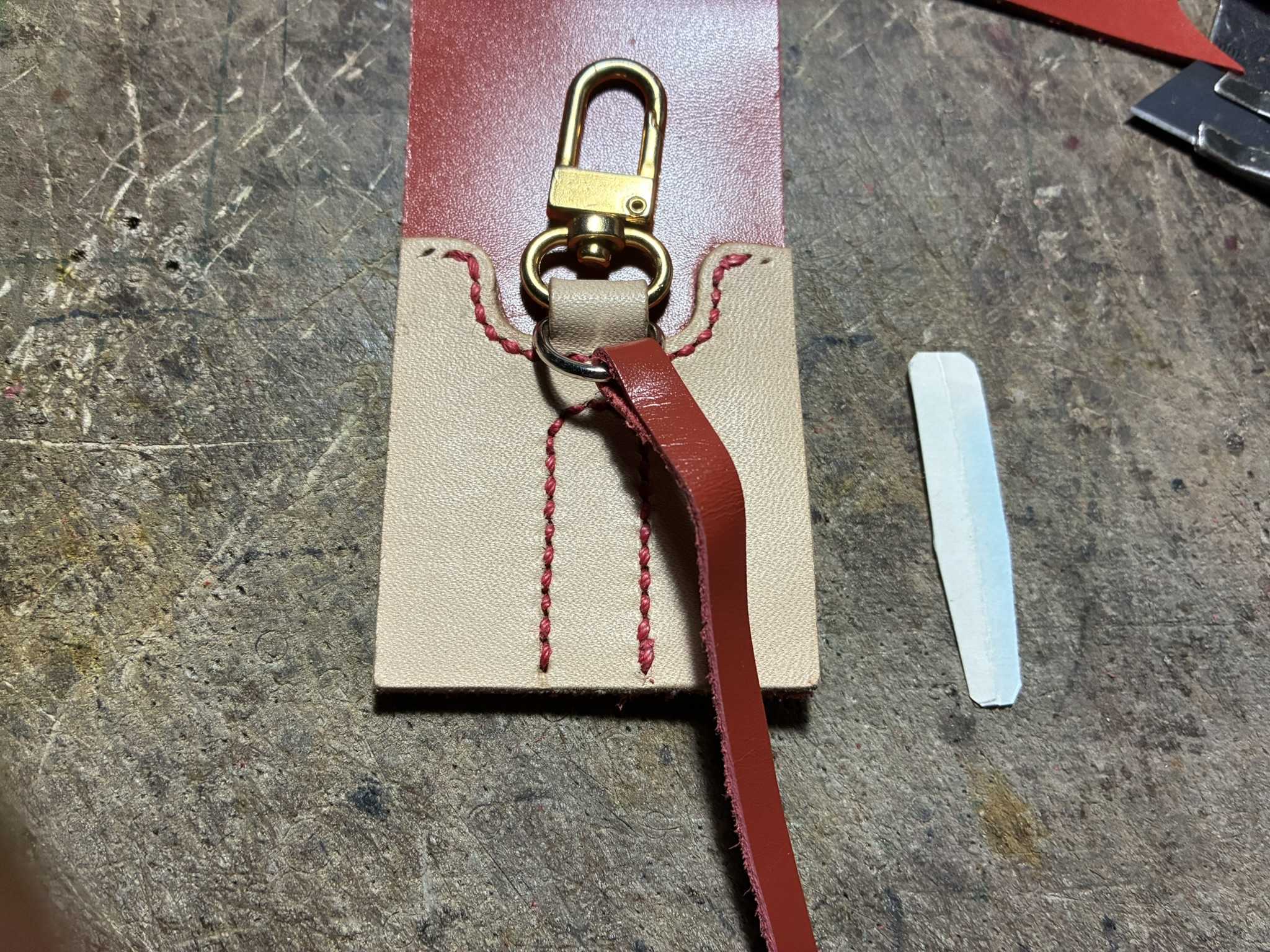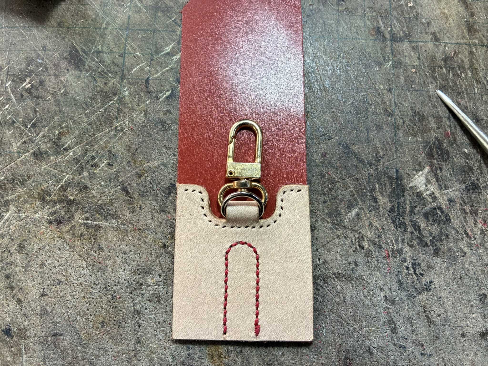 背当て革の上部に、手縫い穴をあけました。Dカンとナスカンを留めを、縫い付けました。物入れ部の下端を、出来上がり線で切りました。