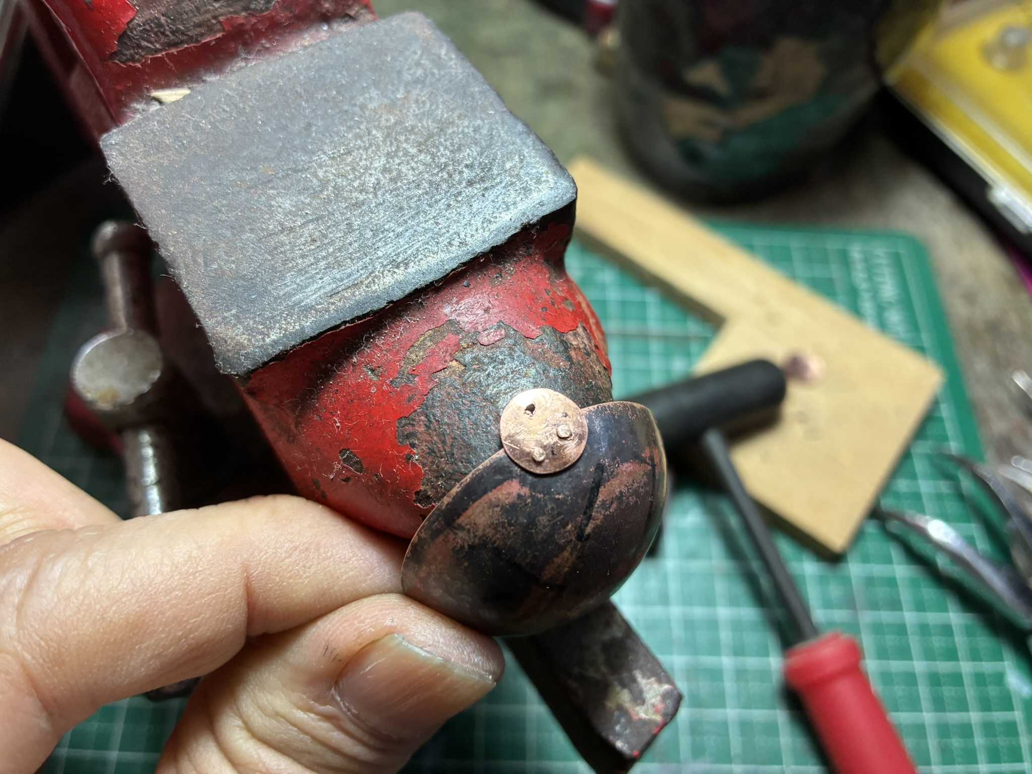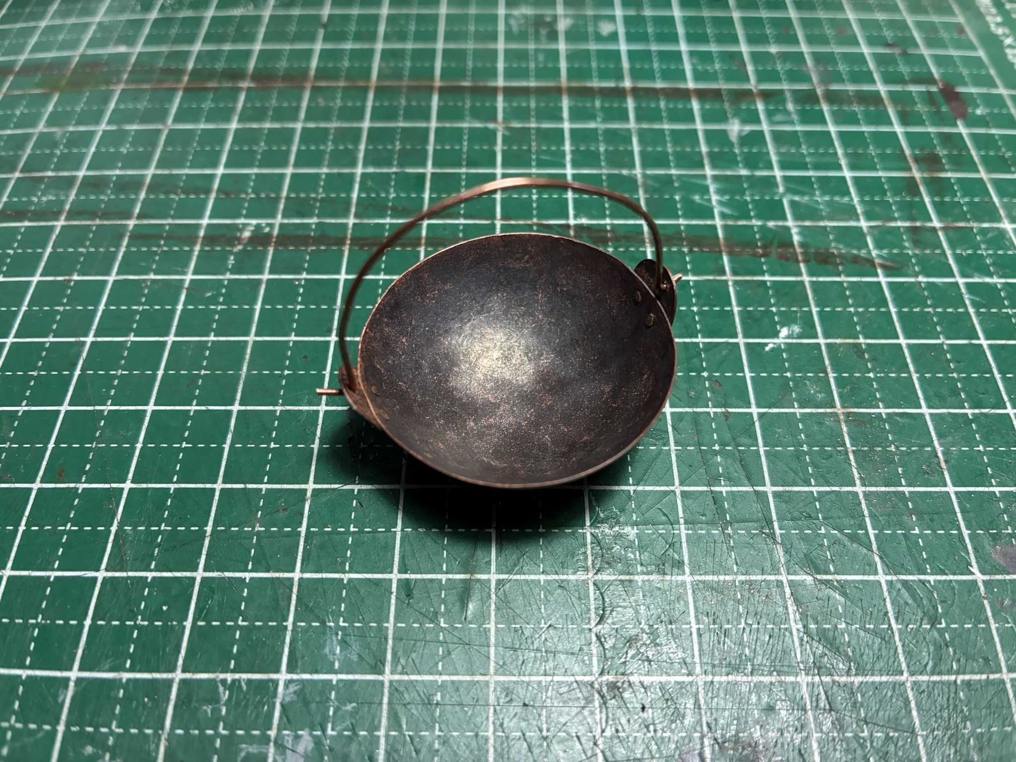 ハムスターの鍋を、銅板で作ります。鍋の形は昔の、底が丸いタイプです。銅板を金切りばさみで切り出しました。銅板の周りに金ヤスリをかけます。銅板を赤くなるまで焼いてから、鉄のサイコロ玉台で少しずつ叩いていきます。