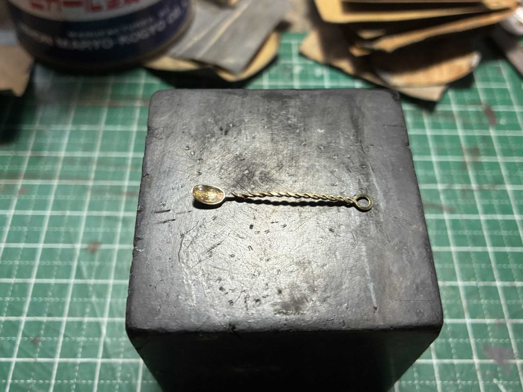 真鍮線と真鍮板でミニチュアスプーンを作ります。楕円形に切り出した真鍮板を焼きなまし、鉄のサイコロに入れて丸みを付けます。真鍮線はねじってYの字にします。楕円形の部分にねじった真鍮をハンダ付けしました。