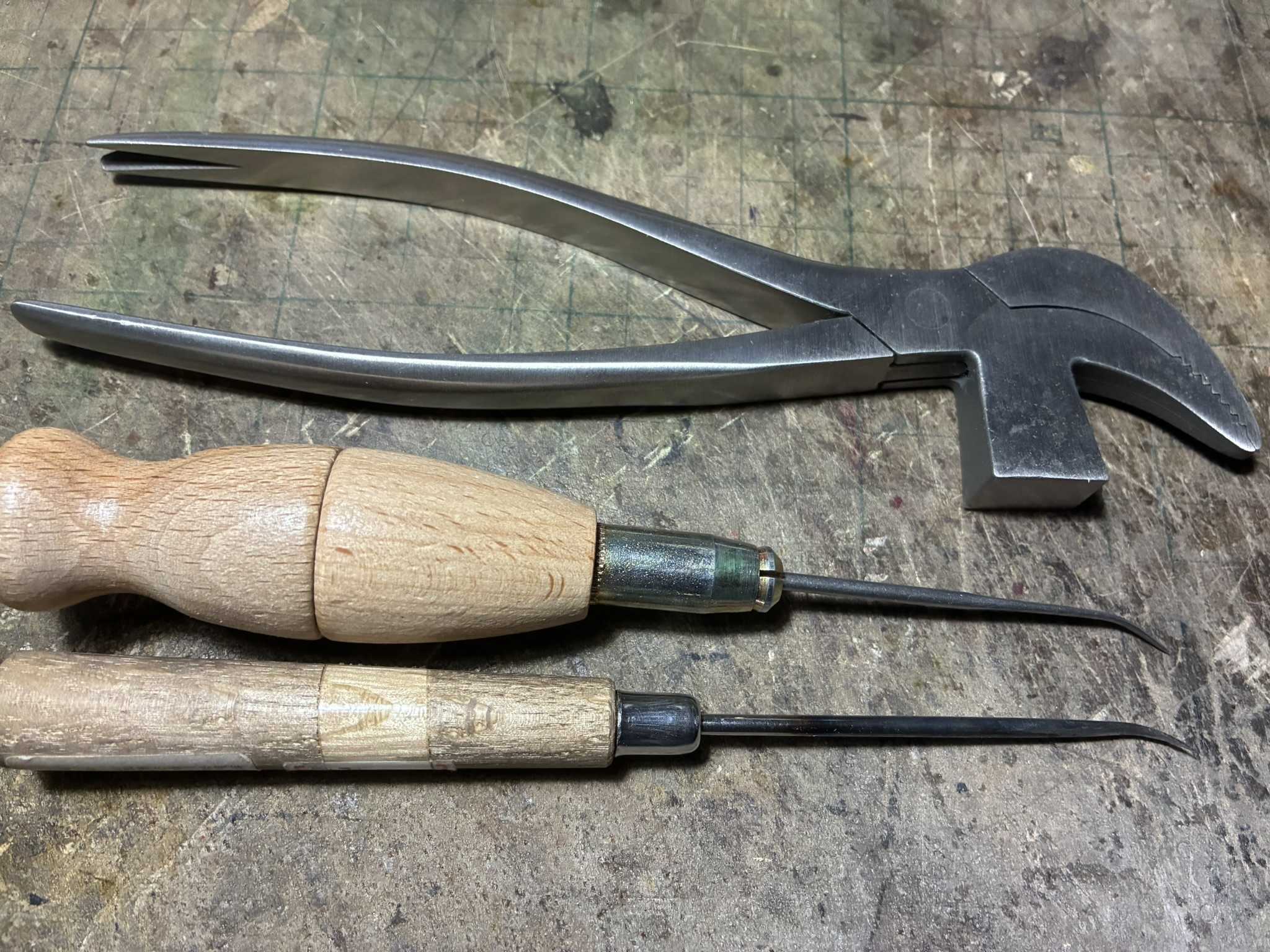 周りにヤスリをかけて、金属磨き剤で磨きました。柄の部分を軽く叩き、少し曲げました。