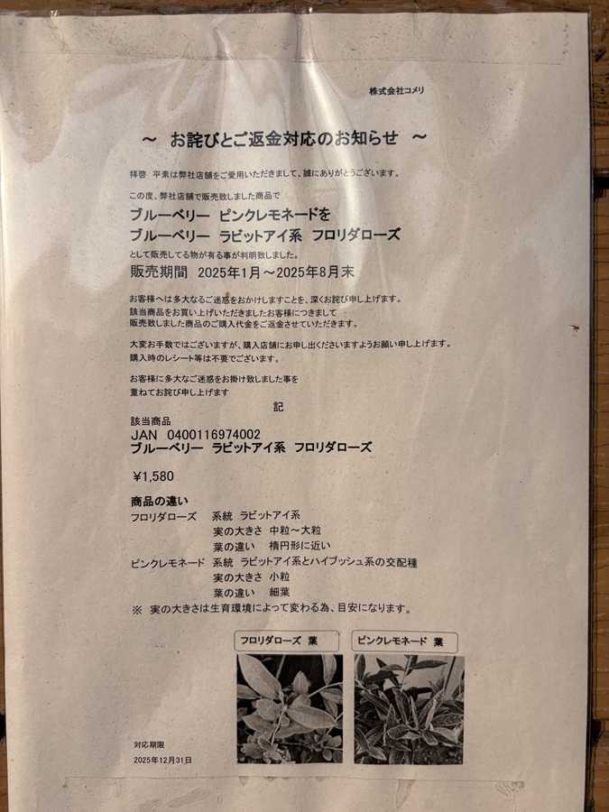 コメリドットコムのブルーベリーの予約苗… 2025年10月24日