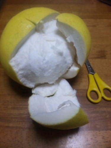 orange cocoさんから届いた晩白柚です。ばんぺいゆ(晩白柚)剥いてみました。すごく綿が厚いです。2センチくらいあるかしら???大きさを比べるためハサミを置いてみました。大きさ分かるかな???味はすっきりしています。水分はそれほど多くなく・・・食べやすいです。実がしっかりして歯ごたえもあります。私の好きな柑橘です。orange cocoさん ありがとうございます。おいしいで~す。