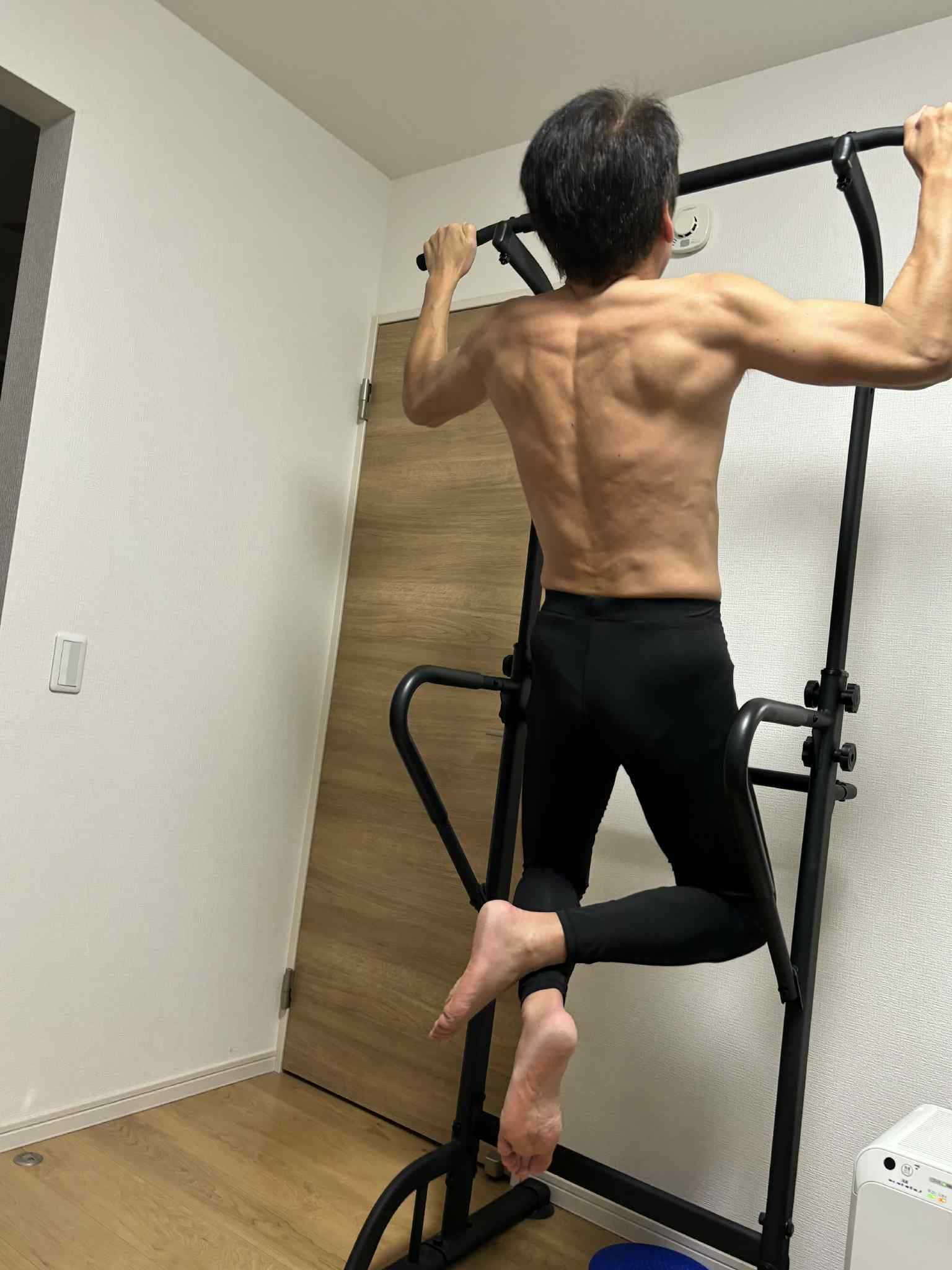 毎週月水金は懸垂をしています。今日のメニューは自分を追い込みました。• 懸垂(ノーマル):12回 / 6回+ジャンプ4回 / 4回+ジャンプ6回• 懸垂(逆手):10回 / 5回+ジャンプ5回 / 3回+ジャンプ7回※セット間インターバルは、あえての「30秒」この短さが、背中に強烈な刺激を叩き込みます。仕上げにツイスト100回。2年前に懸垂マシンを導入した時は、正直1回も上がらず絶望しました。「買うんじゃなかった……」と激しく後悔したのを覚えています😭でも、今は「正しい姿勢(できているかな?)」を意識しても1セット目は8回〜10回は上がります。年齢のせいか、なかなか背中は巨大化しませんが(笑)、少しずつ締まってはきていると自画自賛。すべては、夏休みに海やプールで「かっこいいパパ」でいられるように。そして、守るべき家族のために。今では最高の相棒です懸垂 懸垂マシン 懸垂器具 ぶら下がり健康器 チンニングスタンド けんすいマシーン 筋トレーニング MK301YL