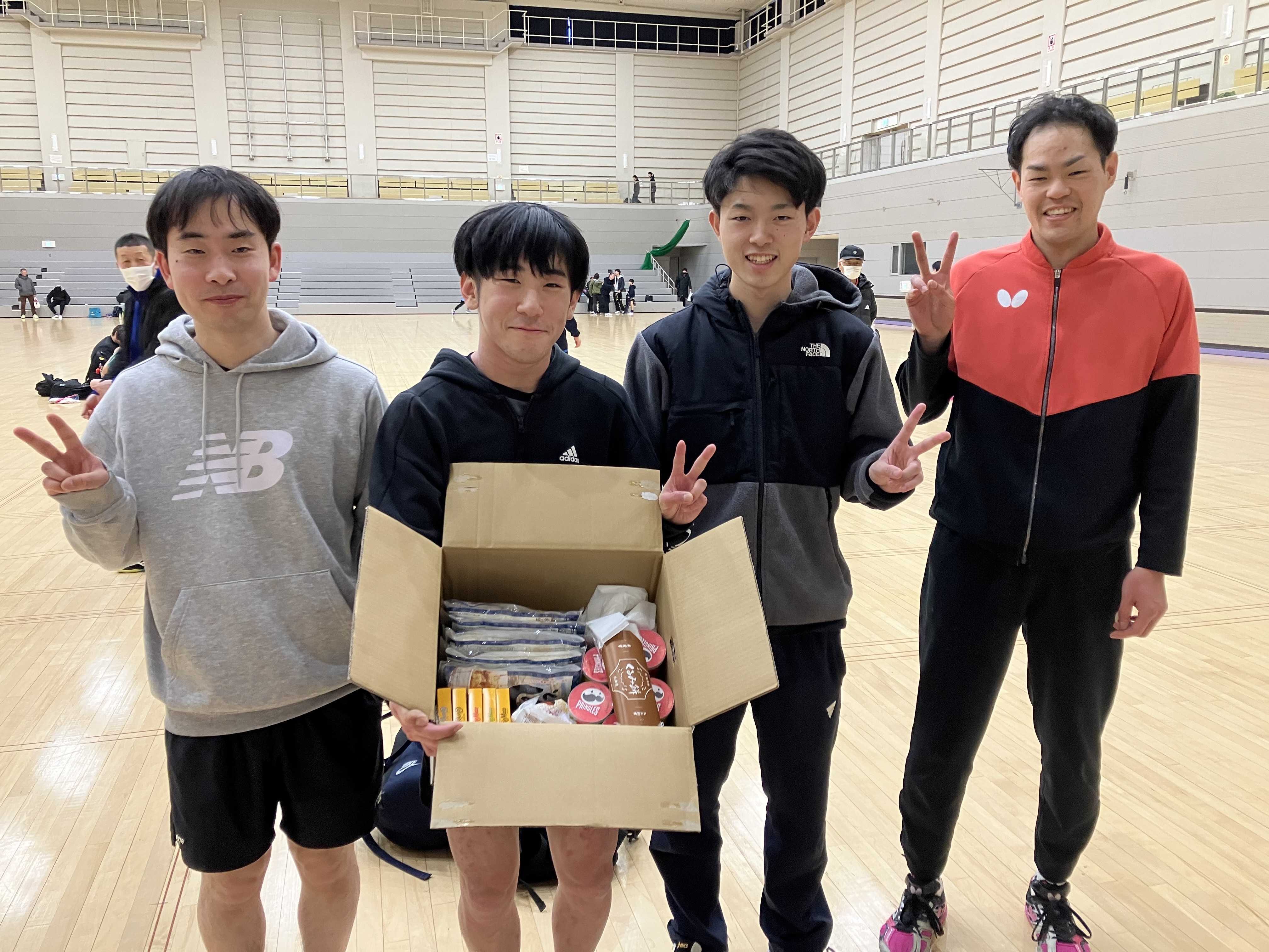 「北海学園・菊卓・ポラリスノースJr.OB」選手全員の頑張りと、私が全試合審判としてカウンターをめくったので優勝することが出来ました。最高殊勲選手「中村くん」予選リーグはなんだかんだ全勝!決勝トーナメントではことごとく相手のエース級に当たって玉砕してくれました。なによりも本業が超多忙な中試合に駆けつけてくれたことが最大の殊勲でありました。今は珍しい「片面ペンドラ」ですが、全国に出場経験のある小中学生を大人げなく撃破しておりました。最大級の拍手を送ります。パチパチパチパチ!高校生2人はシングルス、ダブルスともに全勝と安定して勝ち星を挙げてくれました。準々決勝では歩夢がダブルスとラストで勝利、決勝でもダブルスで勝利。準決勝では石川くんが菊卓会の後輩たちをけちらし笑、決勝でもシングルスで勝利し優勝に貢献しました。エースの門脇くんは全試合ダブルス、シングルスフル出場。決勝戦では、中高と空知地区で戦ったきた美唄のゆうごとの激戦をフルゲームジュースで勝ち切り、チームを優勝に導きました。歩夢と石川くんは高校時にダブルスを組んでおりましたし、門脇、中村くんには小学生の時から練習をしてもらっておりました。チームのみなさんに感謝です。ありがとうございました。また、美唄のパパ、ママ先生。美唄StarJr.の保護者、選手の皆さんには前日練習、宴会、宿泊先まで大変お世話になりました。本当にありがとうございました。前日の練習、夜の部については、今晩か明日更新いたします。私にとってはそっちが本番でした。笑