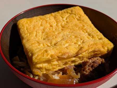 牛丼は3袋で448円なので、1袋149円、ライスは126円。このままだと量も少ないし、栄養バランスも偏るので、玉子焼きをどかんとトッピング!玉子は198円でした。牛丼は出汁が多くて肉は少ないけど、味は濃いめたんぱく質の補強には玉子焼きちょっと甘めの玉子焼きでも、ちょっと塩分が多いかな、牛丼1.4g、玉子焼1.9gで3.3gある
