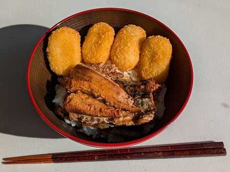 コスモスで8個入りのカニクリームコロッケが税込168円で売られていたので、そのうちの4個を使用して白米に乗せて丼にしました。さんまの蒲焼の特売税込170円でたんぱく質の補充。ライスパックが126円なので、全体で380円で収まりました。かにクリームコロッケ(脂質10.55g/4個)白米(炭水化物58.5g)さんまの蒲焼(タンパク質17.6g)思ったよりバランス良くて美味しいね