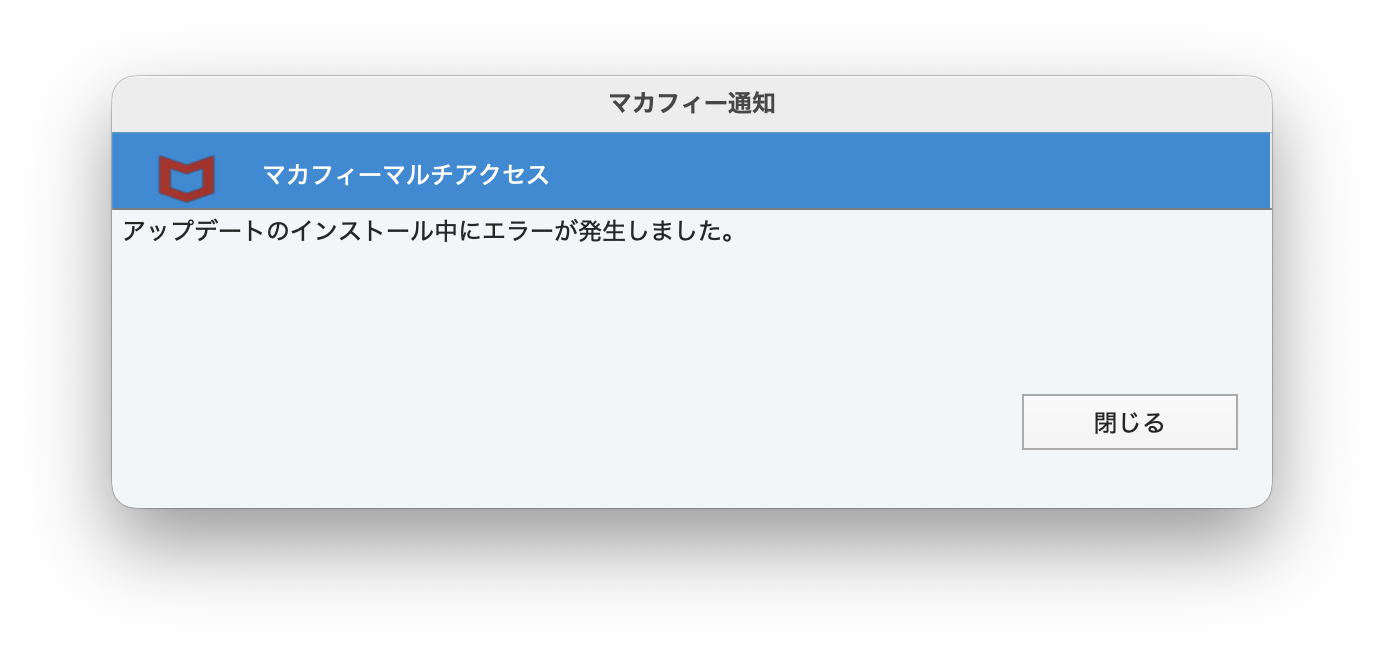 Mac を macOS Tahoe(26)にアップデートしたら、マカフィーマルチアクセスで「アップデートのインストール中にエラーが発生しました。」と、毎日POPが出るようになりました。原因は、OSアップデートでマカフィーの一部が破損した可能性があります。■対応方法1.アプリケーション「マカフィーマルチアクセス Uninstaller」をダブルクリックして、 マカフィーをアンインストールします。2.マカフィーのインストーラーをダウンロードして、インストールします。マカフィーを再インストールすることで、エラーが発生しなくなりました。