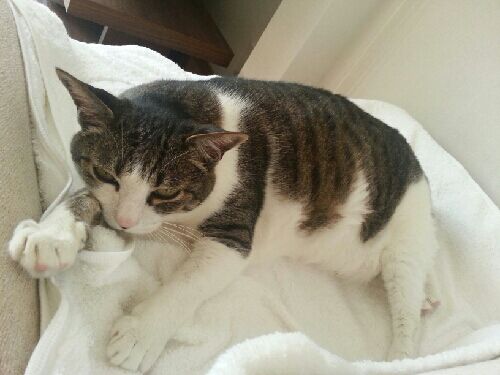 今日の最高気温25度朝は13度、少しヒンヤリでした夕べは雷雨で、雷が鳴るとモモは寝ていても起きてしまいました可哀想だったので背中を撫でてましたモモ、朝ごはんの前に散歩に出ました今日はカラッとして過ごし易かったです昼寝して起きてからも、外に出ました夜、毛繕い中です眠くなったようグッスリ寝ていますカルトナージュで持ち手付きの入れ物を習いましたタティングレースの道具や糸を入れてますパソコンの調子が悪いです写真が上手く取り込めません上手く行くようならアップしたいと思います