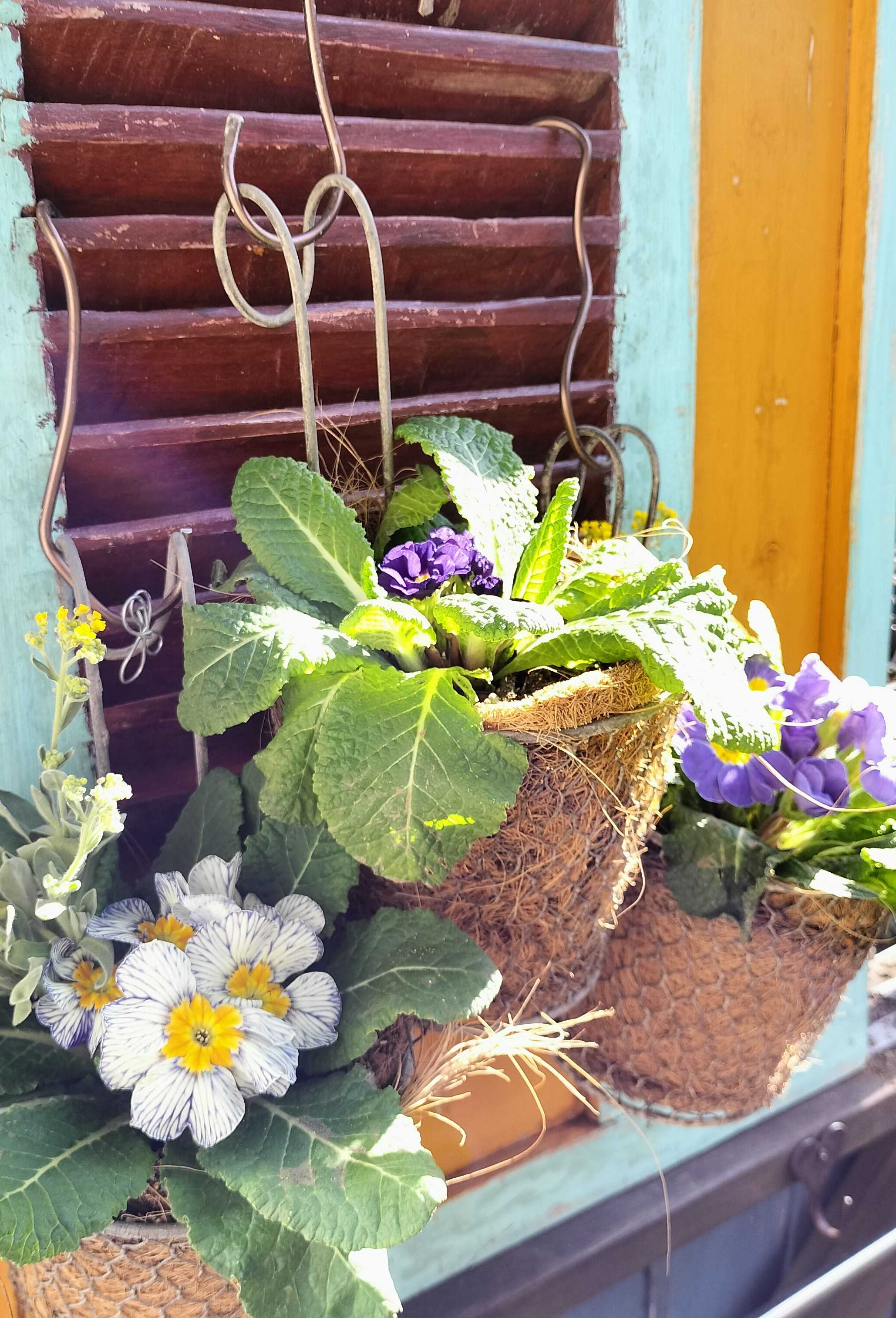 今シーズン2度目のプリムラ購入 プリムラはお値段も手ごろで 今の時期に華やかな花を咲かせてくれます 今回手持ちのワイヤーバスケットに 青いプリムラの花を植えてみたいと ブルー系のプリムラを 3苗選んできました 3苗で700円以下の 一般的なプリムラジュリアンの苗です お値段高めの苗に慣れてきていたのか すごくお安く感じます このプリムラジュリアンを 今アイビーゼラニウムを入れている ワイヤーバスケットに 植え込もうと思います アイビーゼラニウムは 今まで花を咲かせていたし 今もつぼみを持っていますが さすがにしばらく お花はお休みになるでしょう まずワイヤーバスケットの底を ココヤシシートにうつしとりカットします カットしたココヤシシートを ワイヤーバスケットの底に敷き込みます ガーデニング雑貨 ワイヤーバスケット アイアンバスケット 鉢カバー プランター ガーデン雑貨 ガーデニング 雑貨 アンティーク ナチュラル おしゃれ かわいい WIRE ワイヤーポットカバーSET2 PL-626289-60 側面にはココヤシファイバーを 貼り付けるようにおきます この中に土を入れプリムラジュリアンを ひと苗ずつ植え込もうと思います アリッサム サミットも購入していましたが こちらとイオノプシジウムも 一緒に植え込みます こぼれ種育ちのイオノプシジウムの ポット苗です黄花アリッサム ‘サミット’(=アリッサム サキサティレ 植え込み終了 吊るして飾りました こちらの苗にはアリッサム サミットを 二つに分けた苗を植えこんでいます こちらの苗にも 残りのアリッサムサミットを植え込みました こちらには こぼれ種育ちのイオノプシジウムを 植えこんでいます 寒さ厳しい折に プリムラジュリアンの葉が ブーケのようで 見ると元気の出る ワイヤーバスケットの植え込みが 出来上がりました