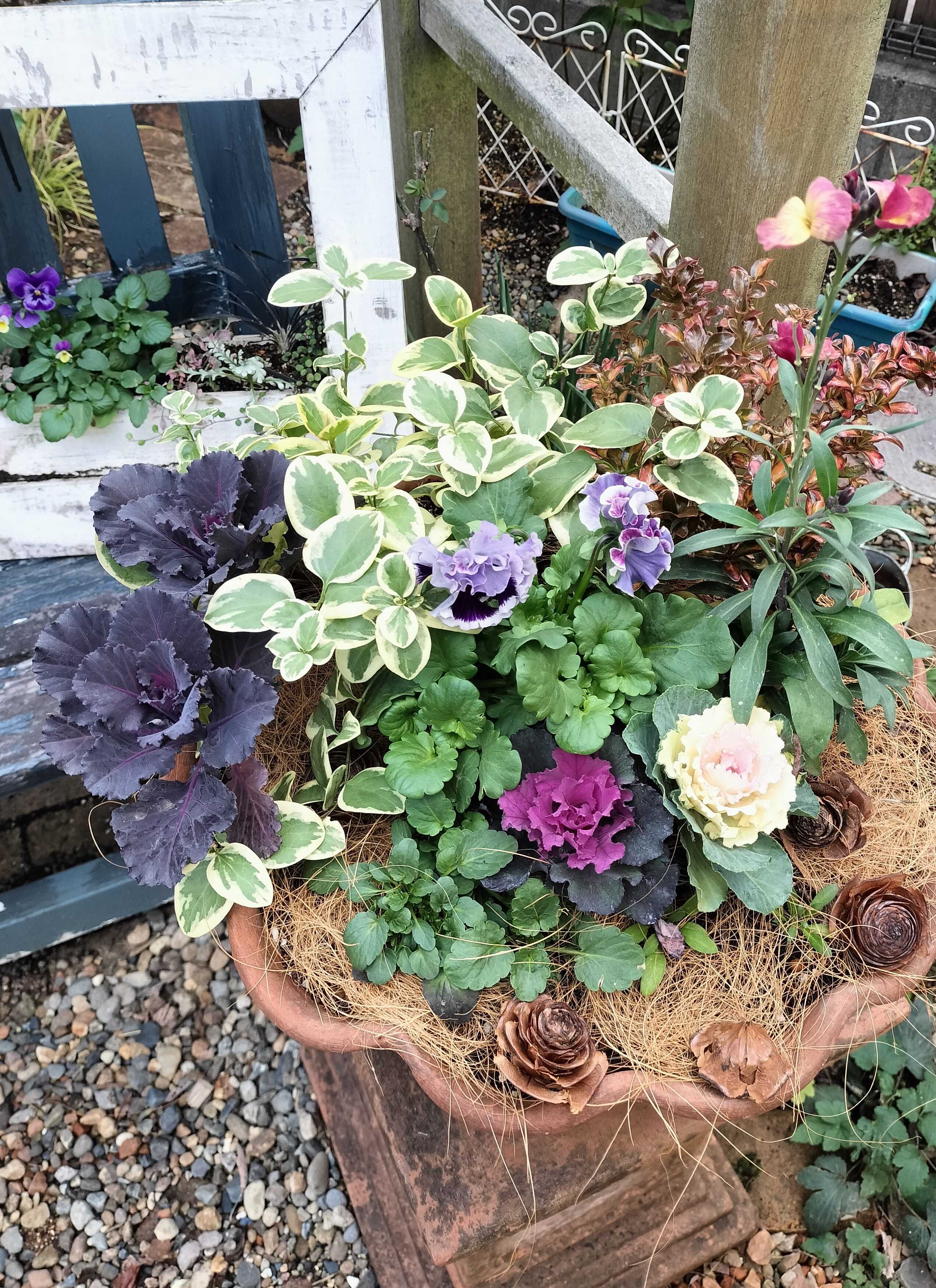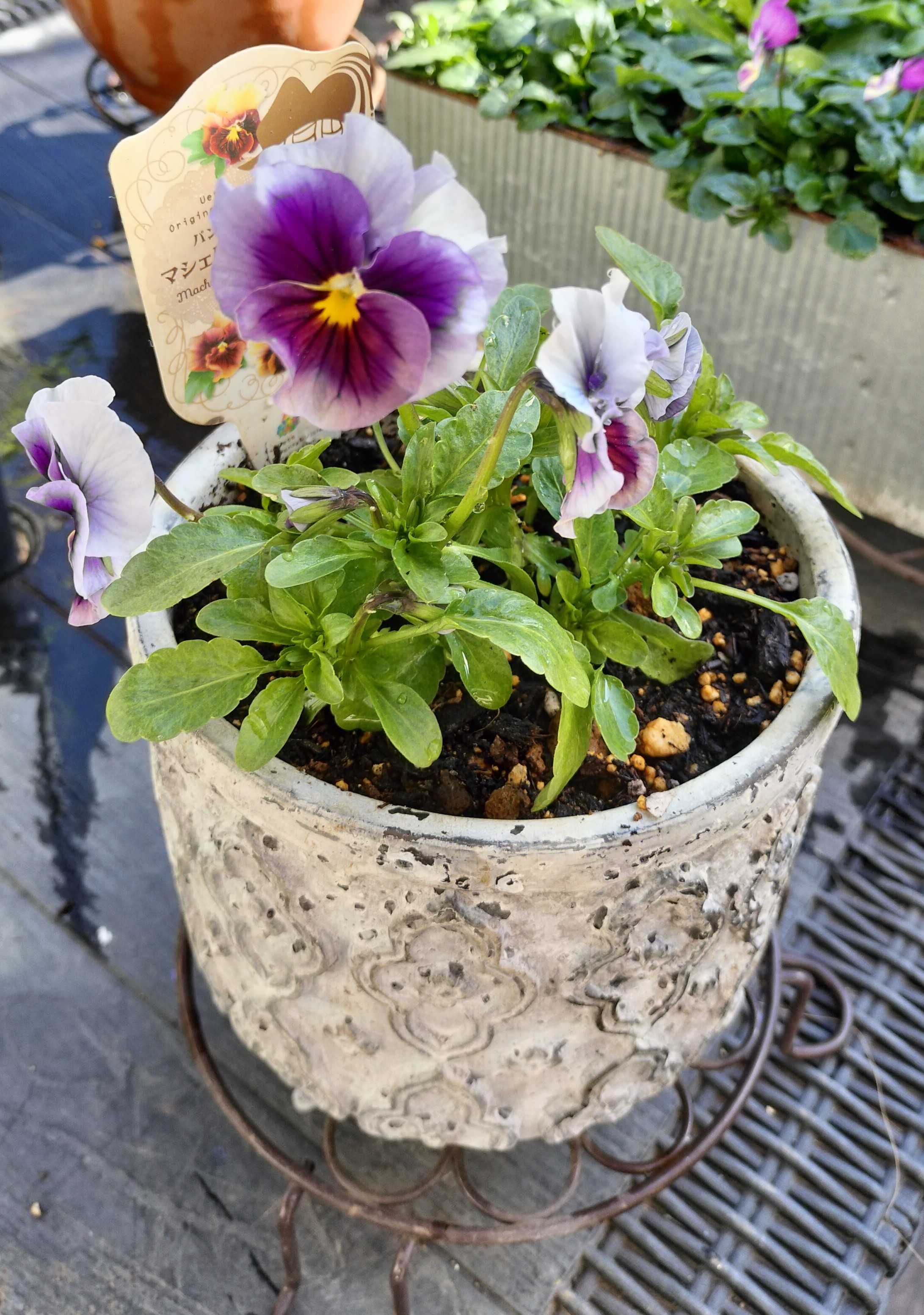 いまの時期は 寄せ植えで花を愉しむことが多いです うちの庭の奥に大きな鉢を置いていますが 冬場のこの時期には いつもより少し多めの苗を植え込み 寄せ植えとして楽しんでます 成長がゆっくりで花ガラ摘みもほぼ無し キレイな姿を長く保ってくれます 気温の低いこの時期こそ 寄せ植えを楽しむ時期なのでしょう 後方のベンチ上に置いてある 額縁プランターには 庭にある植物や種まきっ子苗を使いました それなりの光景を作ってくれます 寄せ植えの際 カラーリーフを加えたいですが 冬場はそのカラーリーフが 寒さに強いかどうか気をつけたいです 額縁プランターにビオラと一緒に植えこんだ カラーリーフはセリフラミンゴ草花苗 セリ フラミンゴ 斑入り 2.5号 霜などに当たると葉が落ちますが 寄せ植えなどに使う場合は 大丈夫です 低温期は葉がピンク色になり美しいです コプロスマも冬の寄せ植えに 重宝しています このコプロスマは昨シーズンに購入し 今年で2年目を迎えます コプロスマは寒さにやや弱いのですが 寄せ植えなどにした場合は大丈夫です 低温期のほうがやはり葉色が美しくなります ツヤツヤの葉色も魅力的です 今シーズンは 新しくコプロスマを迎えました【最新品種】コプロスマ「コロロ」3寸ポット苗 希少 寄せ植え リース コプロスマ コロロです コプロスマにはいろいろな葉色があるので 用途により選べるのもうれしいです この吊り下げバスケットに使ったのは 2種類のクローバー このクローバー・ティントワインは 花友さんに頂いて3〜4年 育て続けています クローバーは夏に蒸れると ダメになりやすいですが寒さには強いです 新たに今シーズン迎えた クローバー・オニキスも寒さの中元気です マイナス10度でも越冬出来るとか花苗 カラーリーフ 耐寒性常緑多年草 多葉クローバー エンジェルクローバー『オニキス』ラベル付き5号サイズ【地域限定送料無料】 そしてこのバスケットの下部分に 植えこんでいるのはタイムフォックスリー これも昨シーズン手に入れたカラーリーフ 2年目の今年も活躍してくれてます【単品 / 3個セット】ブロードリーフタイム タイム フォックスリー 3号ポット苗花苗 多年草 宿根草 グランドカバー カラーリーフ 香り ハーブ ハーブ苗 タイムフォックスリーは ほふく性のタイムで タイムの中でも格別に美しい品種 低温期になると 斑がピンク色になりその美しさを増します 今回紹介したカラーリーフ セリフラミンゴ コプロスマ クローバー タイムフォックスリーなどは 鉢植えで管理する場合 充分寒さに強いので 寄せ植えなどにオススメです そしてこれらは寒さにあたると 葉色が一層美しくなるのも魅力的です やや夏越しに弱い所はありますが 来シーズンにも繋げられたらなと思ってます