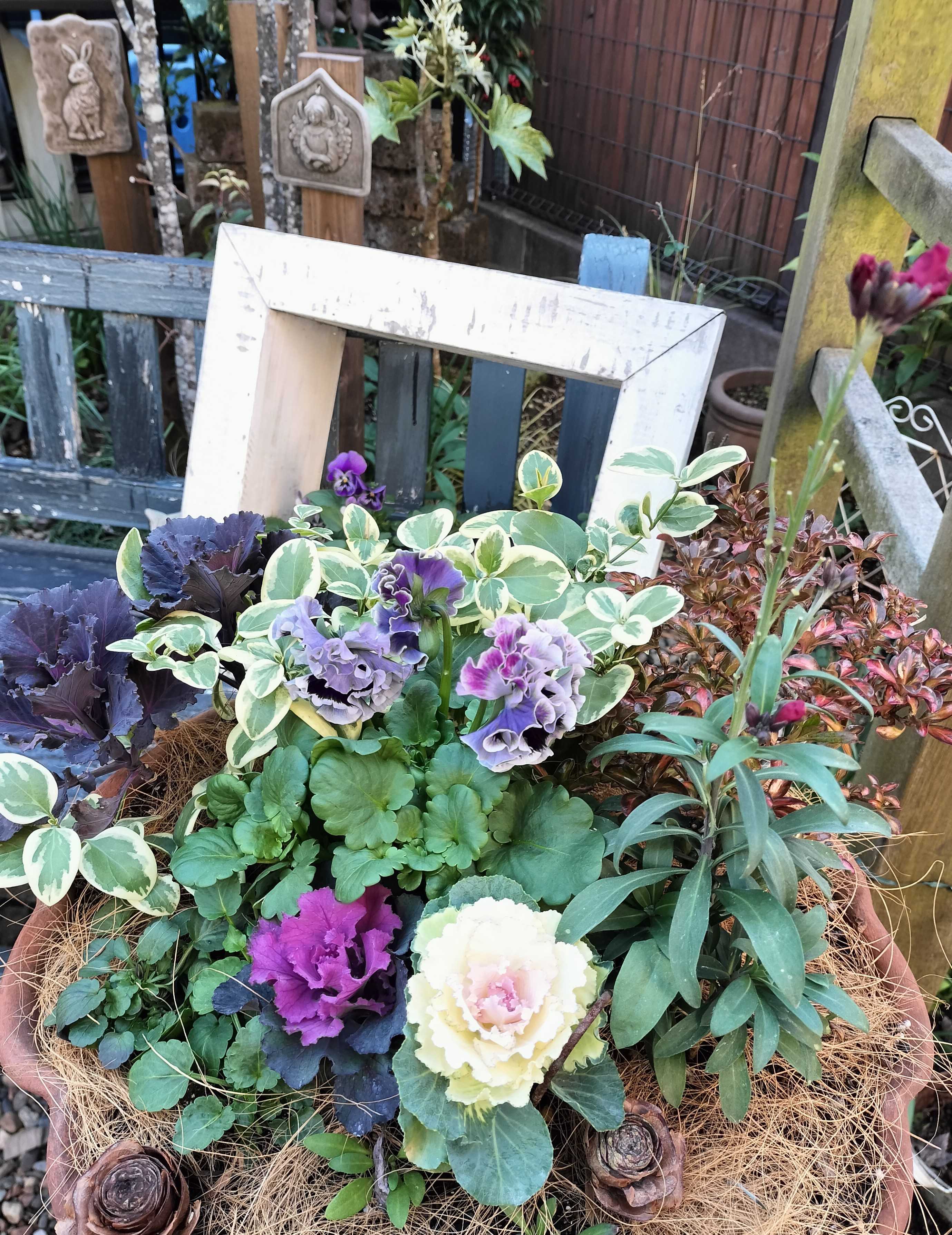 寒さに震える日が2〜3日続きましたが 29日は暖かく風も穏やかで 大掃除日和でした 午後もあたたかかったので 寄せ植えなどの手入れなどもしました 立ち上げ花壇にもシノグロッサムを 植えこみました だいぶ前に植えこみましたが 新年に向けての寄せ植えニ鉢です うちの庭では珍しく 購入苗が中心の寄せ植えです パンジーはコライユステムロング花苗 フリル パンジー コライユステムロング 3号 葉牡丹はミニ葉牡丹ミックスと ブラックリーフ チェイランサスも植え込んでいます花苗 宿根チェイランサス 3色から選べる【お届け中】3.5号 Cheiranthus 宿根草 多年草 赤花 桃花 黄花 春花 ウォールフラワー 香りのある花 花壇 寄せ植え 鉢植え 丈夫 育てやすい ガーデニングす パンジー・コライユステムロングは 茎が長く大振りのパンジーなので 存在感があり気に入っています アンティークビオラ・ファルファリアと やはり葉牡丹ミックス 額縁プランターに寄せ植えしたのは 種まきっ子ビオラと庭にあるものばかり ようやくビオラの花数が増えて 少し華やかさが出てきました 今年購入のお気に入りビオパン 万葉菫 ビオラ・魅黒 アイクルール デッキの飾り棚の上に置いているので 窓を開ければすぐに見られます デッキの反対側の飾り棚には 種まきっ子ビオラや 種まきっ子アリッサムの寄せ植え 開花前の鉢もあるし 花数も少ないですが これからの成長が楽しみな寄せ植えたち 飾り棚に飾っていたリースは 門周りにもってきました 種まきっ子ビオラの開花はまだですが ミニ葉牡丹が ビオラの開花まで活躍してくれてます その下には種まきっ子ストック つぼみをつけていますが 開花は来年かな? こちらも駐車場周りの寄せ植えですが やはり種まきっ子ビオラとストックの 寄せ植えです さすがに色が少ないので 購入シクラメンを追加しています シクラメン・イリュージョア【最新品種】シクラメン「イリュージア ・ピンクラテ」3寸ポット苗 花苗 寄せ植え 花壇 苗 正月 クリスマス 少しマルチングしていますが この場所はかなり寒さが厳しい場所 今のところは大丈夫ですが 1〜2月はどうでしょう 立ち上げ花壇には先日購入した シノグロッサムを植え込みました シノグロッサムは寒さに強いですが 植え込みが遅いので マルチングをしています 立ち上げ花壇では ストック 種まきっ子ビオラ カレンデュラなどが少量咲いています 購入苗の少ない庭なので 全体的に華やかさには欠けるなぁと 思いますが 種まきっ子苗中心の庭は 自分らしい庭なのでしょう 庭も新年を迎える準備 一応完了かな