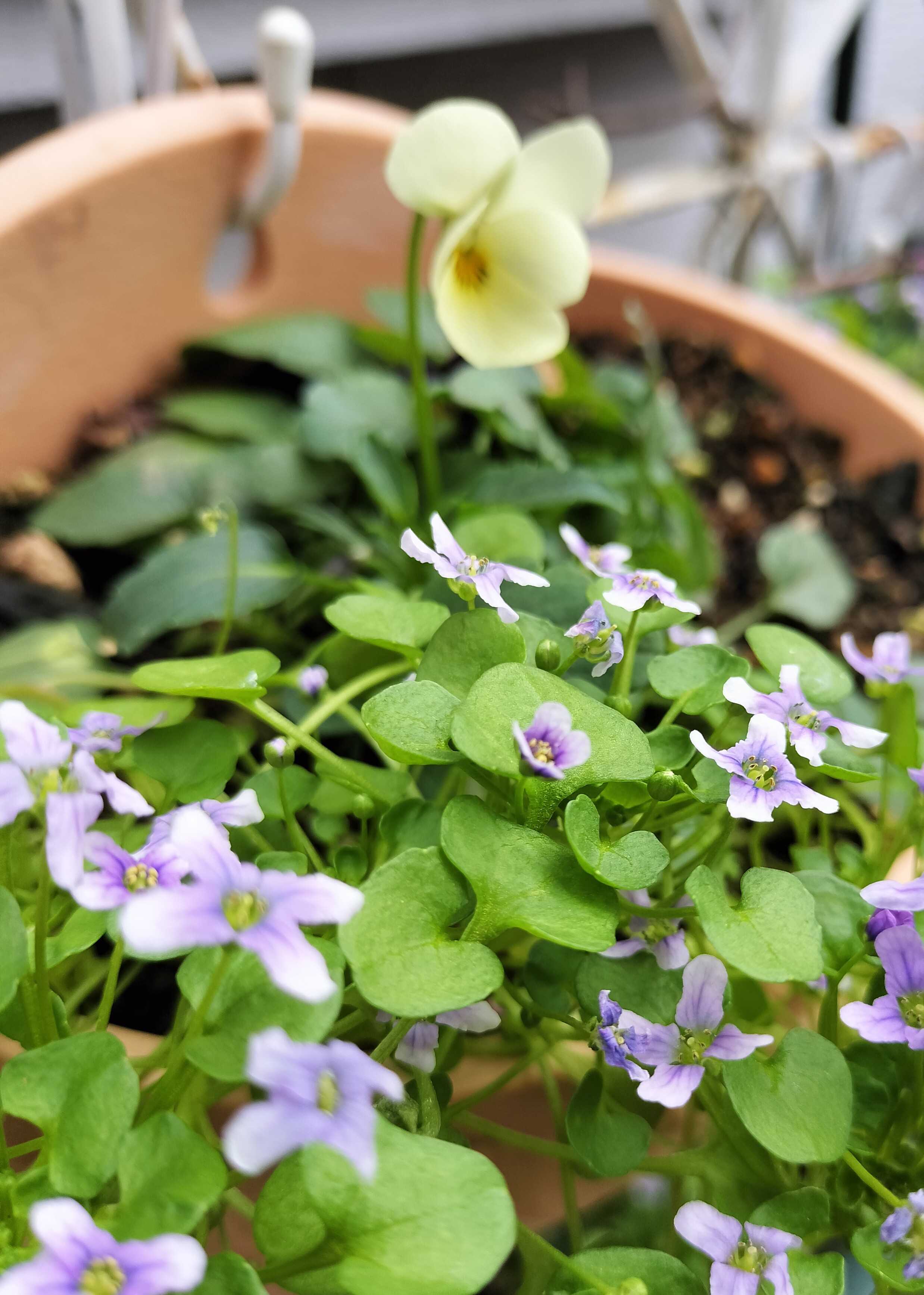 イオノプシジウムが今満開です プリムラジュリアンと一緒に植えこんだのが イオノプシジウム イオノプシジウムは アブラナ科イオノプシジウム属の1年草 花期 2〜4月 花径5〜10mm程の小さな花を咲かせます 耐寒性は比較的高くマイナス5度程度なら 冬越し出来ます イオノプシジウムはあまり苗が 流通しません ただこぼれ種で簡単に育つので 上の写真のように吊り鉢で イオノプシジウムを育てていると そこからタネがこぼれ 下部分にこぼれ種育ちのイオノプシジウムが 広がります こちらが上の写真の鉢などからタネが落ち こぼれ種で育ったイオノプシジウム 一般的な開花は2〜4月ですが こぼれ種育ちで温かい日が続いたこともあり 今イオノプシジウムは満開です コチラの吊り鉢のイオノプシジウムも満開 イオノプシジウムがこぼれ種で発芽した時 まだ小さな苗を ビオラなどと一緒に植えこんでおくと とてもよく合います まだビオラが ぽつりぽつりとしか咲いていない状態でも 先にイオノプシジウムが 満開に咲いてくれるので寂しく感じません まだビオラが咲いていない寄せ植えも ありますがイオノプシジウムが ビオラが開花するまでカバーしてくれます 前に垂れるように咲いてくれるので 半円形のポットに植え込むのもよいです コチラの吊り鉢では ビオラもかなり開花してきていて イオノプシジウムと一緒でよい感じです こぼれ種育ちのイオノプシジウムを ポットに植え込んでおくと 寄せ植え材料として重宝します草花の苗/イオノプシジウム(バイオレットクレス)3号ポット 小さな小花としてアリッサムも 重宝しますが タネから育てたアリッサムは 何とか咲き出してきたものの まだこんな小ささ 【単品 / 3個セット/5個セット】スイートアリッサム 混色植えパステルカラー 3号ポット花苗 秋 冬 寄せ植え コンテナ 花壇 鉢植え 販売されているアリッサムは 満開状態ですが うちの種まきっ子アリッサムの満開は 2月後半になりそうです 今満開のイオノプシジウムが終わる頃 アリッサムが満開を 迎えてくれるのではないかと 期待してます