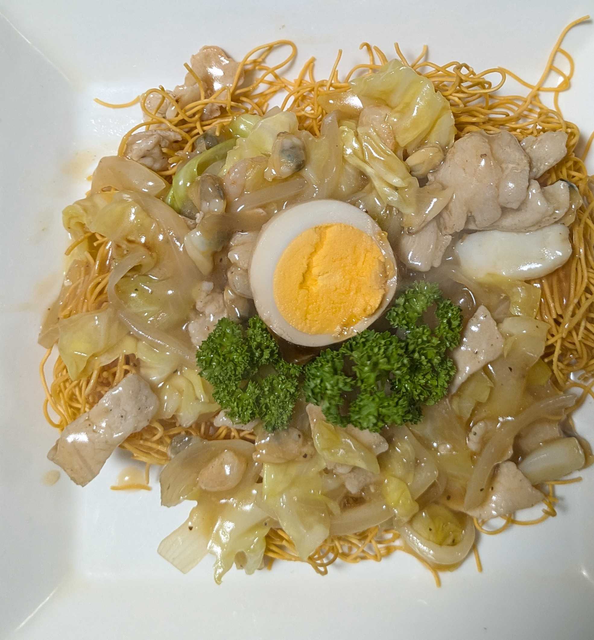男料理(夕食)皿うどん 豚肉 エビ イカ アサリ 茹で玉子 デザート(夕食…