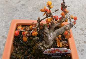 家内は外泊中! 盆栽の実はツルウメモドキ、キ…
