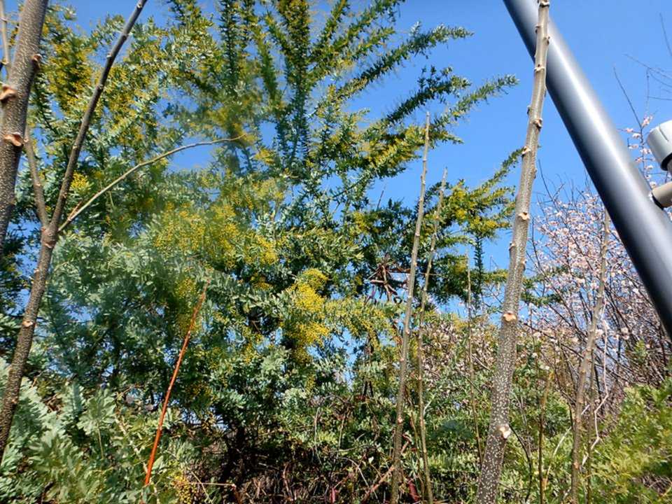 ミモザ、梅と軍人勅諭の碑、木の洞、青々とした…