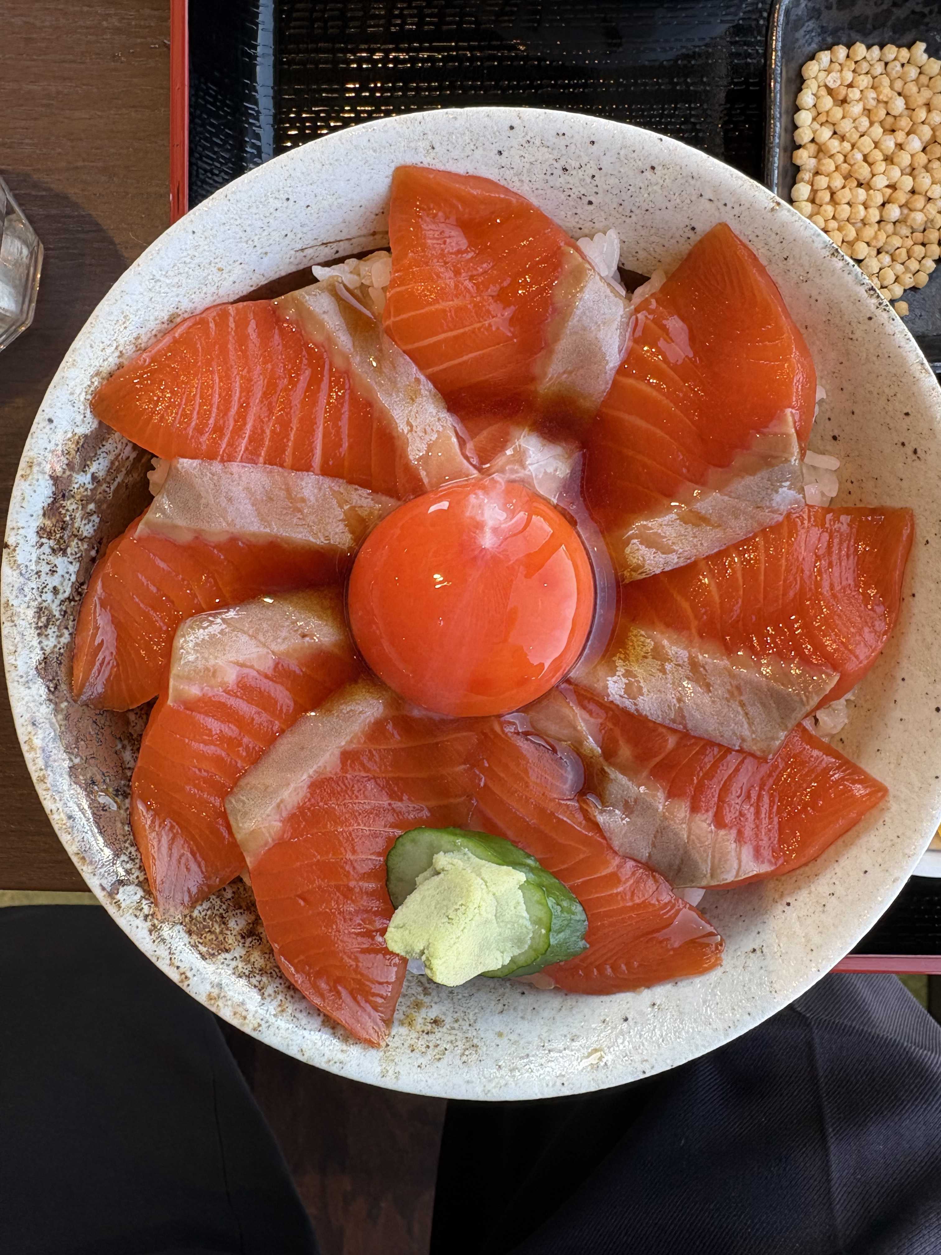 六ヶ所村出張でした道の途中にある八戸港フェリーターミナル内のレストランシルバーでランチですサーモン漬け丼とひらめ漬け丼を2人でシェアしました宮古産トラウトサーモンはトロッと八戸前沖ひらめはプリッと自家製タレが絶妙津軽のブランド卵十六代 真っ赤卵卵黄が濃厚美味しい‼️半分食べたら、だし茶漬けに2種類の丼+2度美味しい4倍楽しめました苫小牧行きのフェリーシルバーティアラを眺めながら爽快感抜群のいいランチができました帰り際に厨房から出てきた男性から挨拶されました10年ほど前よく行った居酒屋のマスターでしたその居酒屋には月2〜3回くらいのペースだったのでそこそこの常連だったかな安くて鮮度のいいものを提供お気に入りの居酒屋だったしばらく前に店をたたみ最近ここの支配人になったそうですなるほどね美味しいわけだね顔を覚えていてくれてて声をかけてくれて嬉しかったね…と同時に自分もこの町で古い人間になったんだなぁ〜と実感した次第ですサーモン漬け丼 宮古産トラウトサーモン使用八戸前沖ひらめ漬け丼
