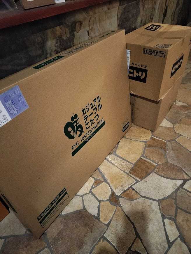 お荷物でーす!宅配業者さん、次々と。ハイハイ、、あれれ、これは??次は、、カモ肉?冷蔵?ハイハイ、。次は、、あ、滞在中の衣類ね。と、どんどん来た。おこた、そうですか、。。と、大掃除。お正月の用意、それなりに、。。