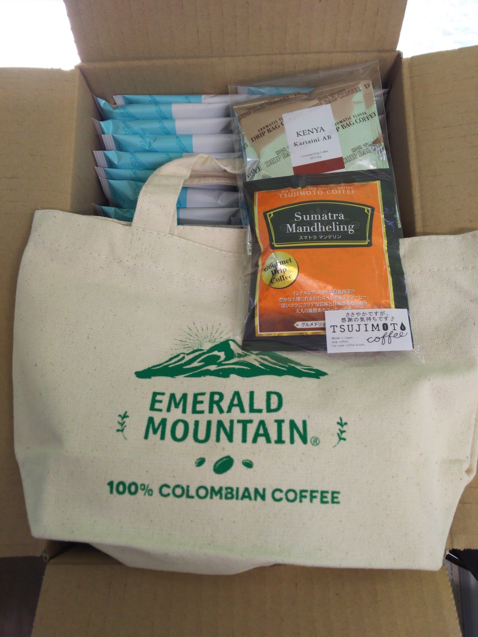 色々種類のコーヒーを頼んでいますが、それぞれのいい味があります。このエメマンは苦みは少ないですがコクがあるのでお気に入りです。おまけはケニアとマンデリンと御覧のバッグです。