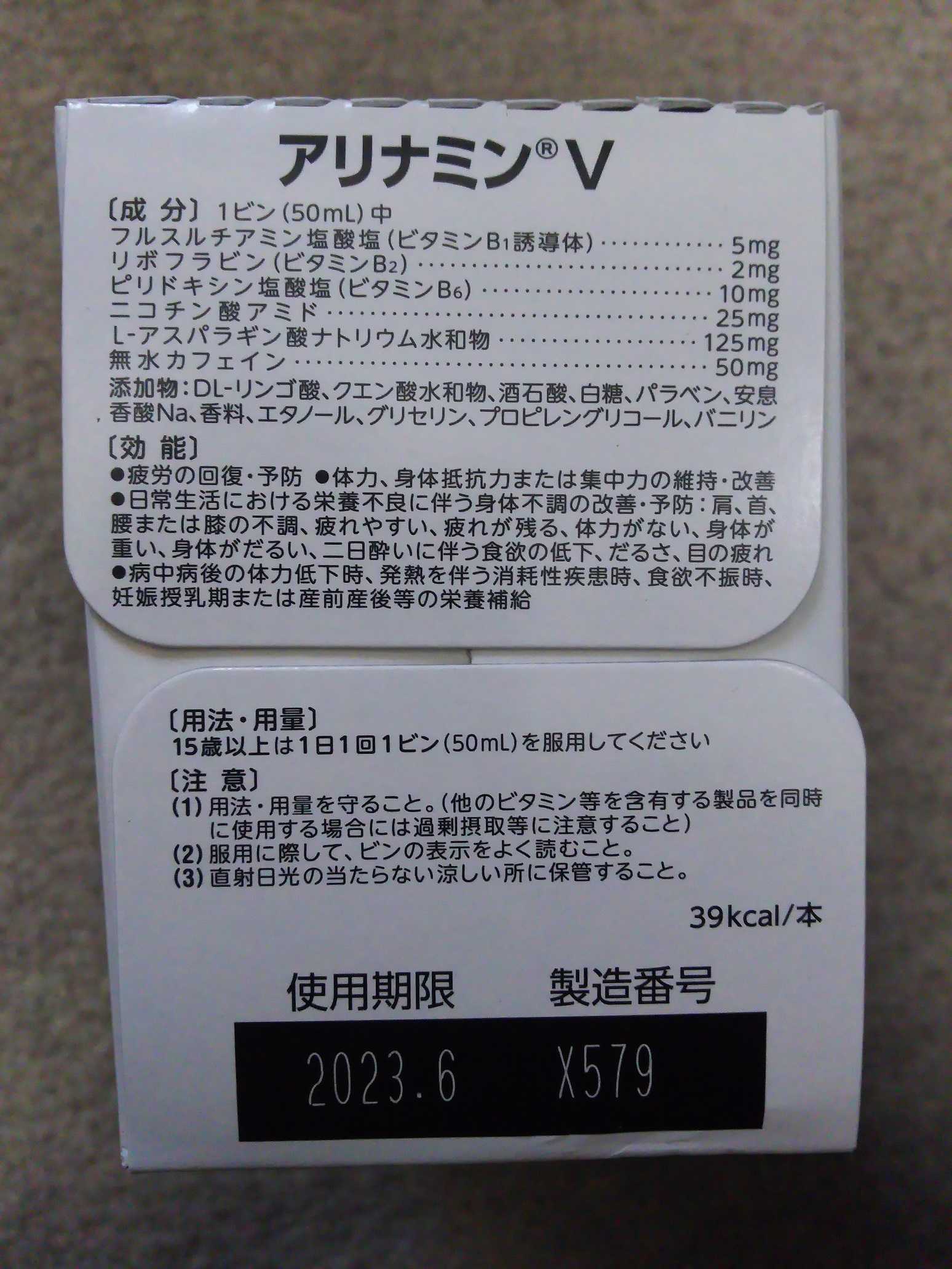 寝不足や調子の悪い朝に一本飲みます。こういう時はゆっくり休むことが必要ですが、そうもいかないときにはアリナミンVの力を借ります。その日の夜は栄養を取って早く寝てゆっくりと休みます。