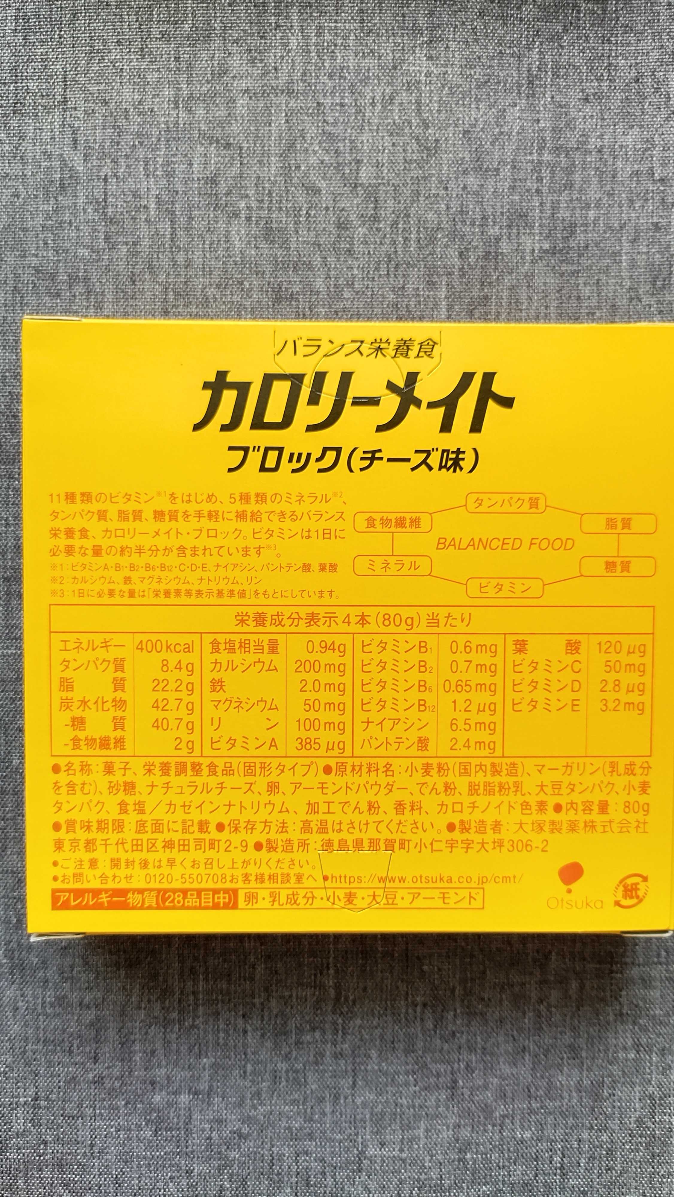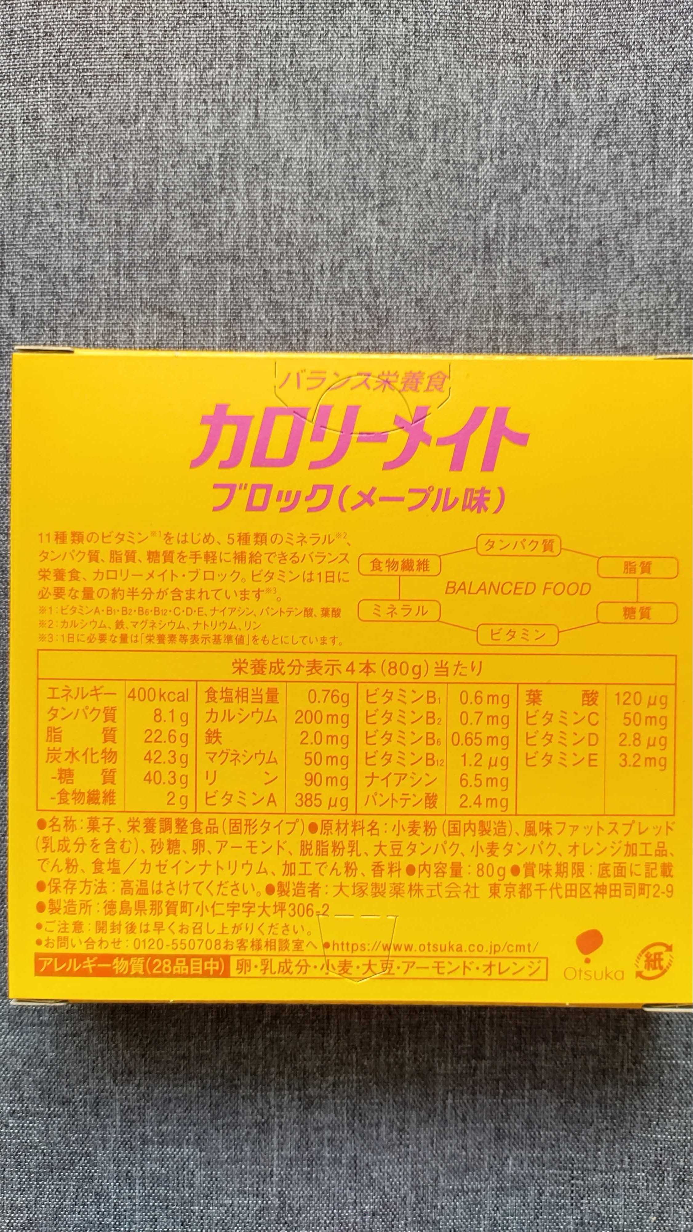 いつもお昼に頂いています。こちらはメープル味です。栄養は十分あり1箱4本で400kcalなので十分です。常に家の中にランニングストックしておくようにしています。