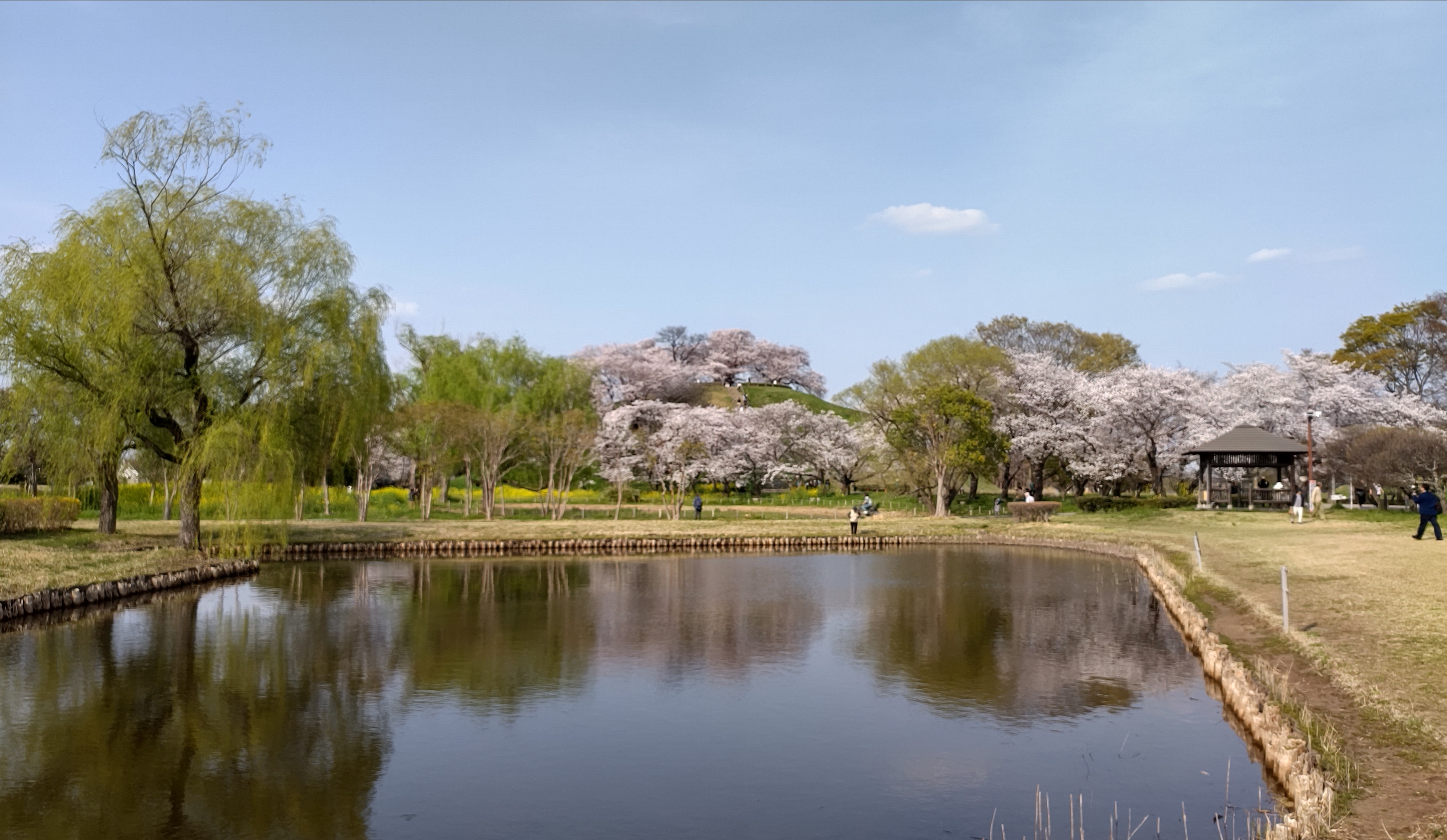 埼玉古墳公園の桜 中奥が丸墓山古墳ご近所の学校では桜が満開です。