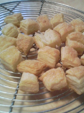 小さくカットした生地に塩とパルメザンチーズを乗せて焼く。