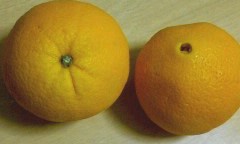 私のこれまでの経験では、写真右のように、へたの対面側に窪みがあるオレンジのほうが、皮が剥きやすいようです。