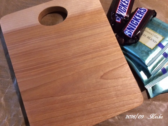 上の階の友人から小さなカッティングボードを頂きました  ティバックとスニッカーズ付き