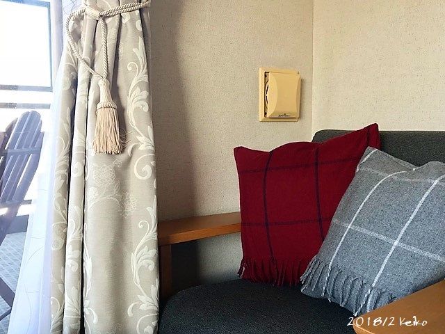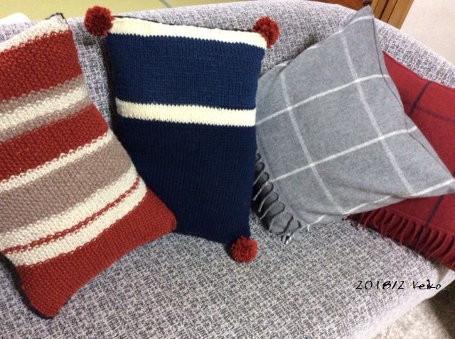 紺の方はモチーフを付けるのにちょっと手間がかかりましたがソファーに置くとイメージが違います