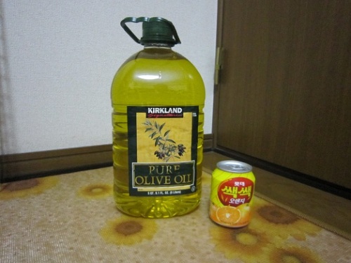 思い切って買っちゃいました 「特大 オリーブオイル」 家で、結構パスタを作るのでオリーブオイルは欠かせません。 ちなみに、大きさがわかるように隣にジュースの缶を置いてみました。 私の好きな「セクセク」です