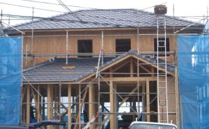 昨日からスタートした瓦の工事がほぼ終了しております。2階の屋根の上にも瓦が敷きつめられました。これで雨が降っても安心でも周りの家が茶系の瓦が多いので渋い色だけど逆に目立つような・・・お盆休みを取っていた大工さんも今日から作業開始。1階の合板を張り始めていた。