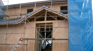 バルコニー側の2階の窓枠を取り付ける部分すべて一度合板を張ってからその部分を丸ノコできれいに大工さんがあけていきました。ちなみにタマの場合(関東?)は合板ではなく浸透性があり火に強いモリスが標準使用であるが、うちの支店では、モリスも使えるがあえて合板を使用しているとか展示場を建てる時にモリスを使用したそうですが釘を打つと割れてしまったそうで営業さんいわく お勧めできないとのことで合板を使用しております。