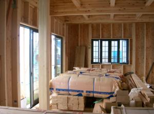 昨日台風7号 マリアが通過し久しぶりに雨できれば屋根が付くまで雨が降らなければと思っていたが、しょうがないか今日は壁・屋根用の断熱材が搬入されていた。1階床同様に断熱材を変更しています。高性能グラスウール75mmタイプどれくらい効果があるかわかりませんが