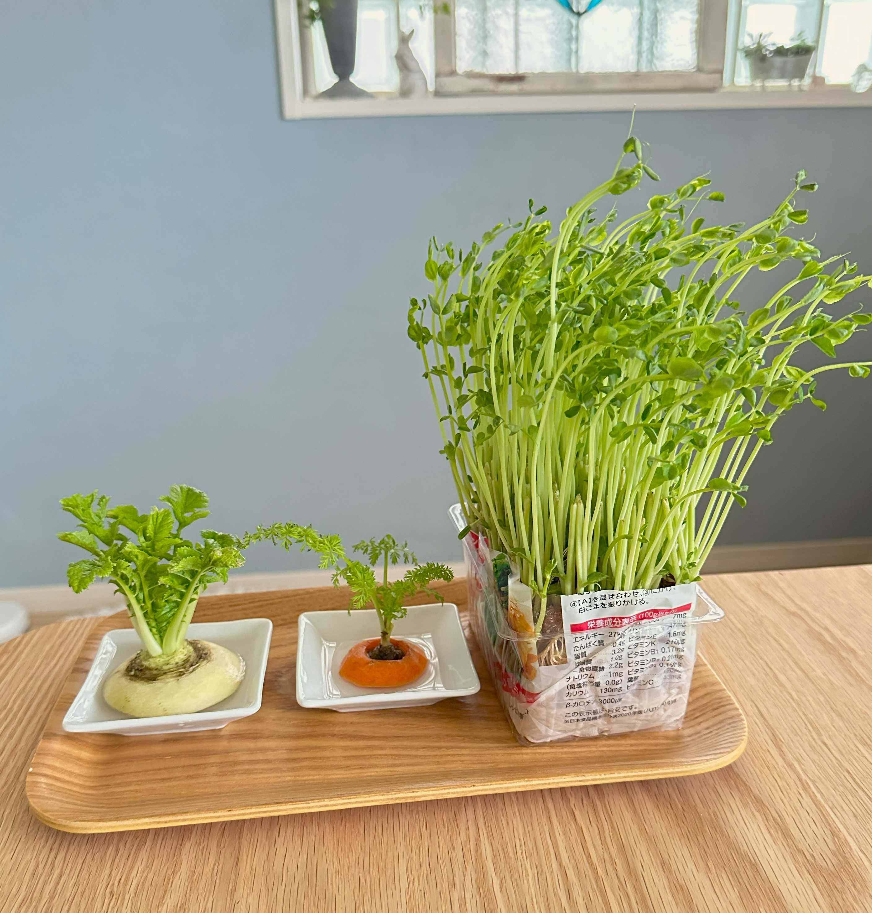 リボべジとは…生の野菜を調理したり、食べたりした後に残った根やへたなどから、再び食べられる部分を育てて収穫する方法のことです。先日、テレビでリボべジ特集を観ていて、『あれ?私って豆苗育てたことないかも!』って気づいちゃいました;で、さっそく豆苗パックを買ってきて、その日の夜に「豚バラ肉ともやし&えのき蒸し」に色どりとして豆苗をドサッと投入。そして!残った茎と根っこの部分でリボべジ開始豆苗のパッケージにも再び育てる方法がちゃんと記載されてるのね♪ついでに、ニンジンと大根もリボべジスタート毎朝、水を換えて日当たりの良い窓辺に置いてみたり試行錯誤すること約1週間…立派に育ってくれましたちゃんと日が当たる方向に育っていくのが可愛い数時間で向きが変わるので、日に数回、回転させていましたでも…豆苗のパッケージの再利用感がそんな時、またまたテレビで豆苗を育てる専用のプランターが「セリア」で売っていることを知り…早速、購入してきました豆苗プランター ホワイト 21×12.5×高さ6.4cm (100円ショップ 100円均一 100均一 100均)【スーパーセール 6月6日~6月9日21時まで 最大ポイント5倍】リッチェル スプラウトファーム24型N IV アイボリー 4973655705117 栽培 家庭菜園 豆苗栽培 かいわれ栽培なんと!楽天でも売ってました