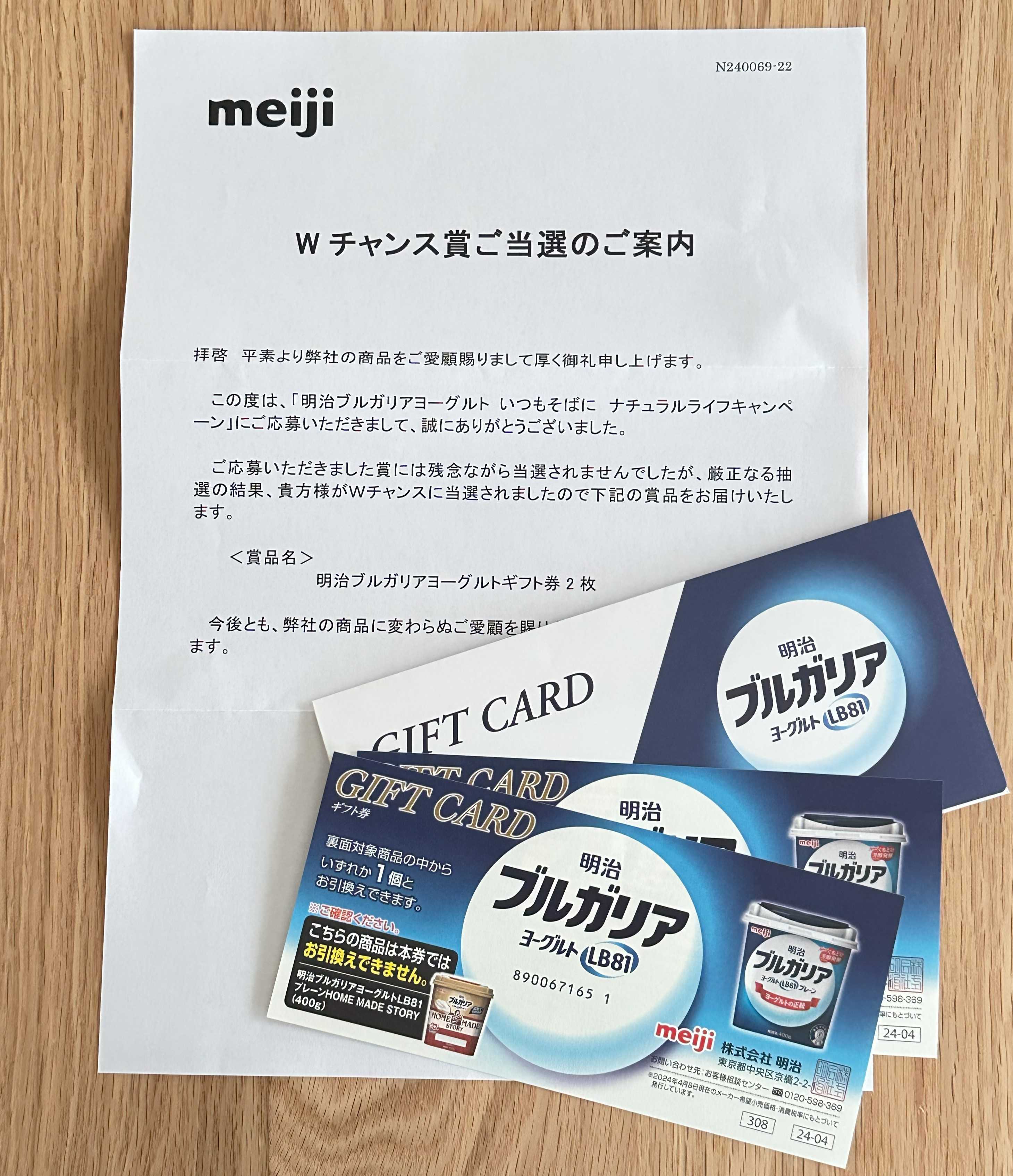 今朝、書留で封書が届きました差出人はmeijiさんからでしたが…はて開封してみると…そういえば!数か月前にヨーグルトの懸賞に応募したわブルガリアヨーグルトの内蓋のマークを切り取って、キャンペーンサイトからハガキをダウンロードして、印刷して、マーク貼って…住所書いて…切手貼って…ポストに投函このメンドクサイ作業…嫌いじゃない(笑)昔から『当たるかも』って応募して、応募した事すら忘れる人です。ちなみに貼る切手も年賀はがきのお年玉抽選で当たった切手を貼る主義!昨年10月からハガキの切手代も値上がりしたから…なかなか気軽に応募もできないね;Webは倍率高そうだしな…それにしても久しぶりの当選は素直にうれしい~ Wチャンス賞だけどブルガリアヨーグルト2つGetです明治 ブルガリアヨーグルトLB81 プレーン【クール便】(400g×6コ) 食べる ヨーグルト 特定保健用食品 乳酸菌うちの近所のスーパーでは150円ちょいくらい…2つで300円~400円…わざわざ書留で送ってくださり恐縮です明治 ブルガリアヨーグルトLB81 プレーン HOME MADE STORY(ホームメイドストーリー) 【クール便】(400g×6コ) 食べる ヨーグルト LB81 乳酸菌ほんとは…こっちのホームメイドストーリーが好きよ