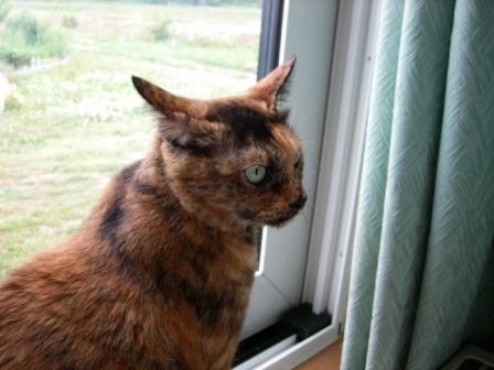 最近仕事してても、集中できないです。話半分ぐらいしか頭の中に入らないし・・・疲れがたまってるのかな?おまけに、ブヨに噛まれて体のあちこちが痒い!痒すぎるぅ~去年の10月に鷹栖に引越ししてきたので、こんなに痒いなんて思わなかった!外の景色はいいんだけどね、車の騒音は無いし、月明かりは綺麗だし、星空も綺麗!猫達も遊び場が増えて喜んでるしね。部屋の窓から外を見ている(左がチェリーで右がロン。女の子です。)