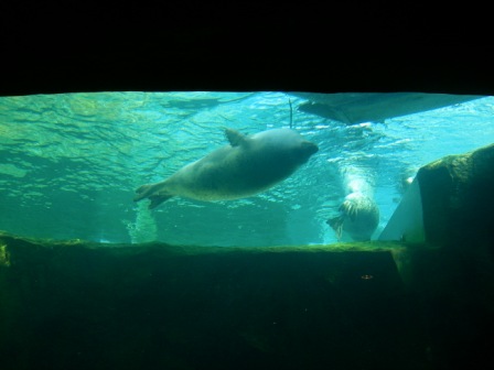 あざらしです、水中を泳いでるのがリアルでわかる。あざらしも結構大きいですから、迫力はあります。マリンウェイを通っています、動きが早いのでタイミングとるの難しいです。こちらは外からみたあざらしじゃれあってましたよ、楽しそうでしたよ~休憩?してるのかな?やっぱり冬の方が動きがいいですね。